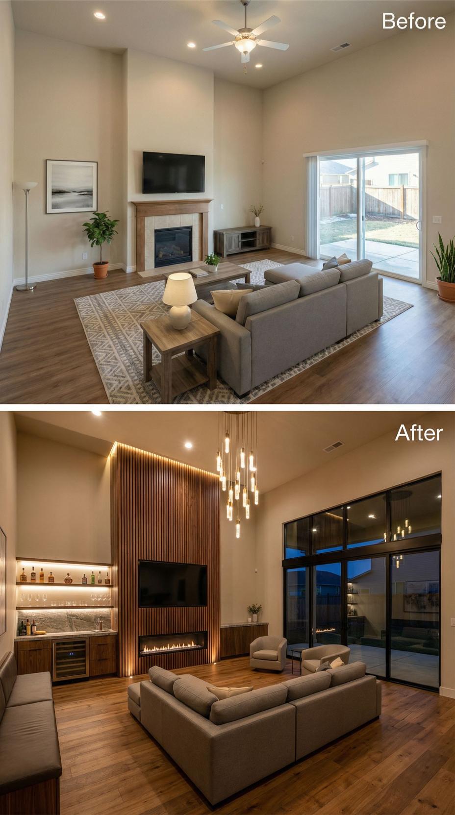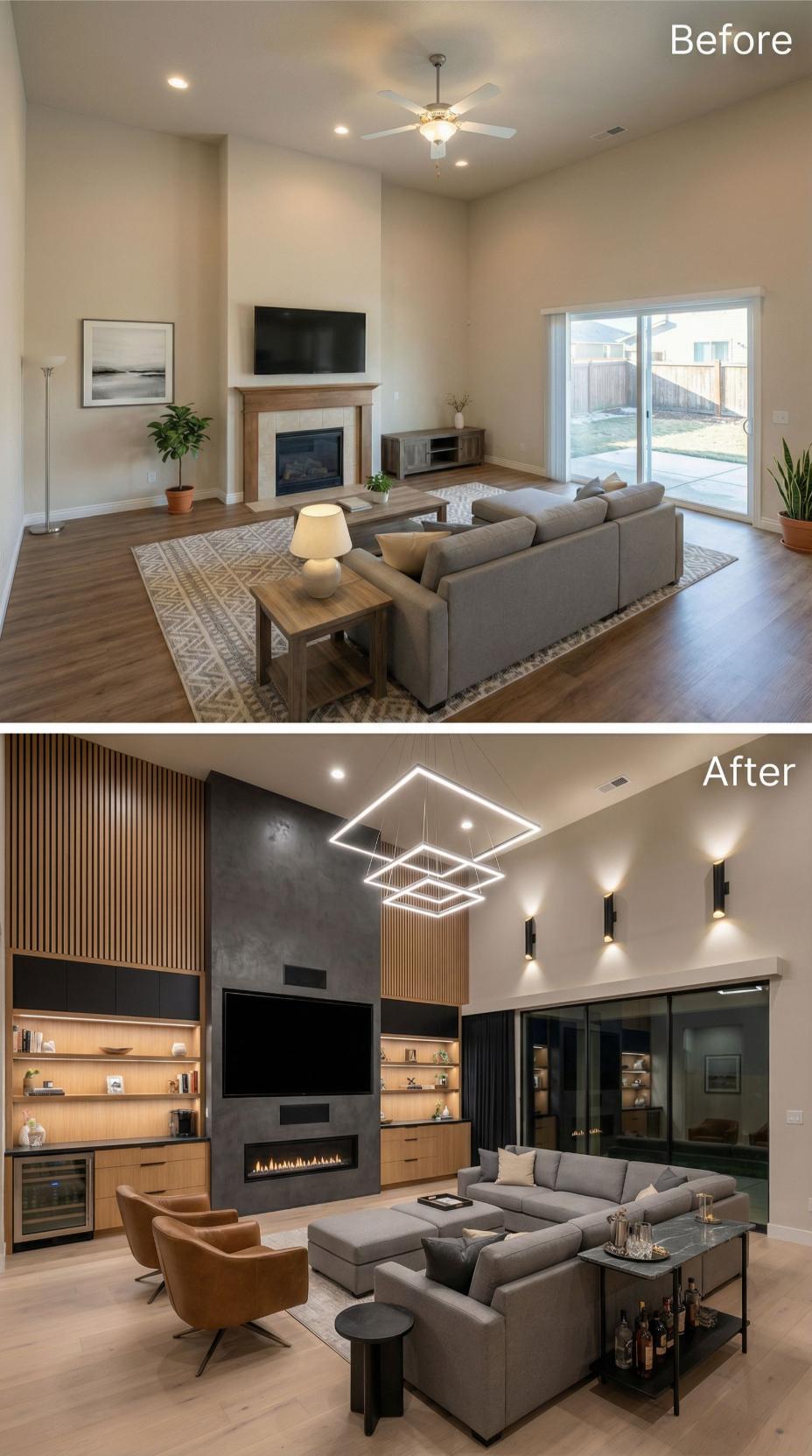 What started as a builder grade living room with standard fixtures transforms into a sophisticated entertainment haven. The original ceiling fan gives way to dramatic geometric lighting, while plain walls now showcase rich wood slat texturing around a sleek linear fireplace. A custom wet bar with illuminated shelving replaces basic corner space, and herringbone wood flooring elevates the foundation beneath modern modular seating.