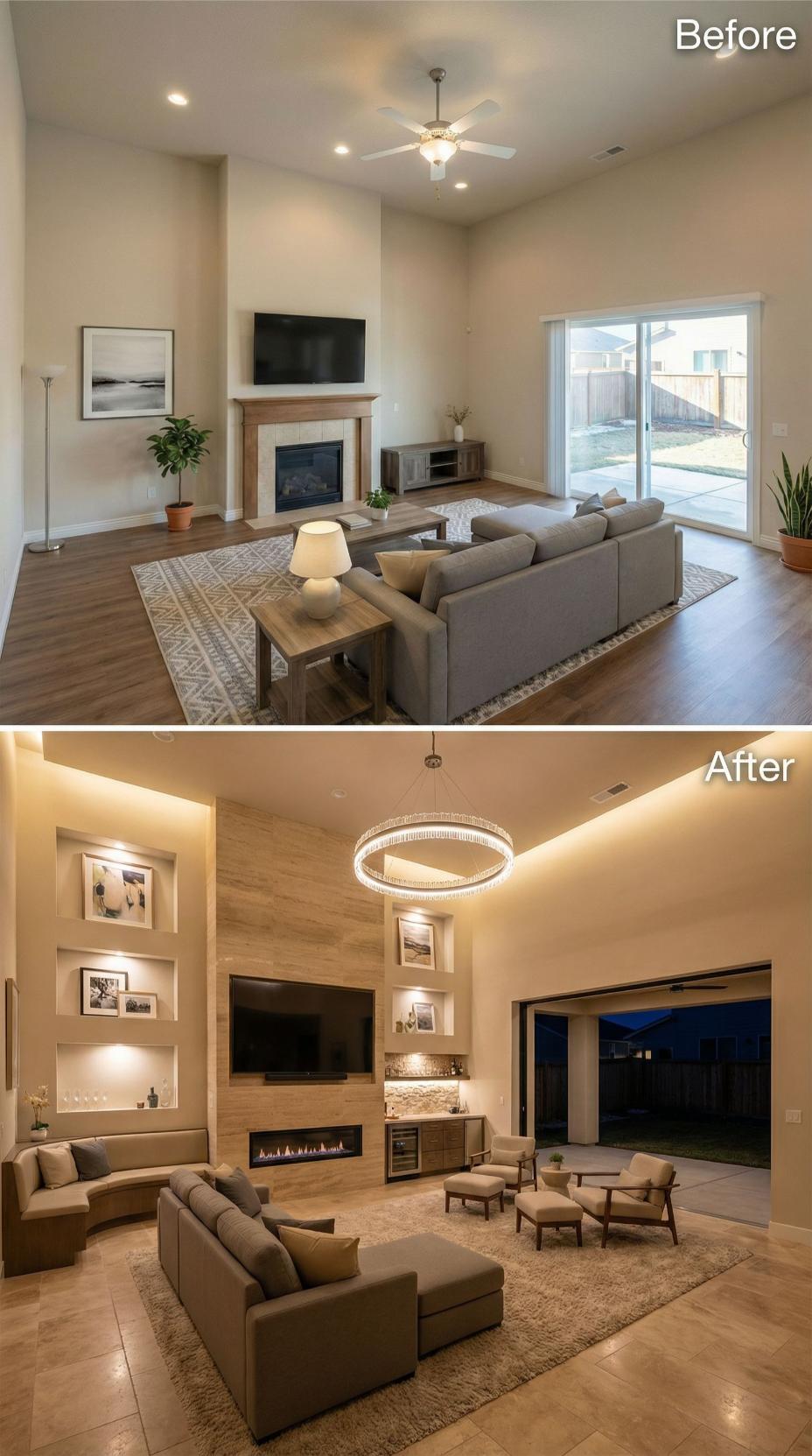 Builder grade living room limitations disappear through strategic upgrades that maximize visual impact. Modern linear fireplace replaces traditional surround, creating sleek focal point beneath mounted television. Coffered ceiling with integrated LED lighting eliminates basic overhead fan, while pendant cluster adds sculptural interest. Polished tile flooring and built-in bar area transform the space into sophisticated entertaining zone.