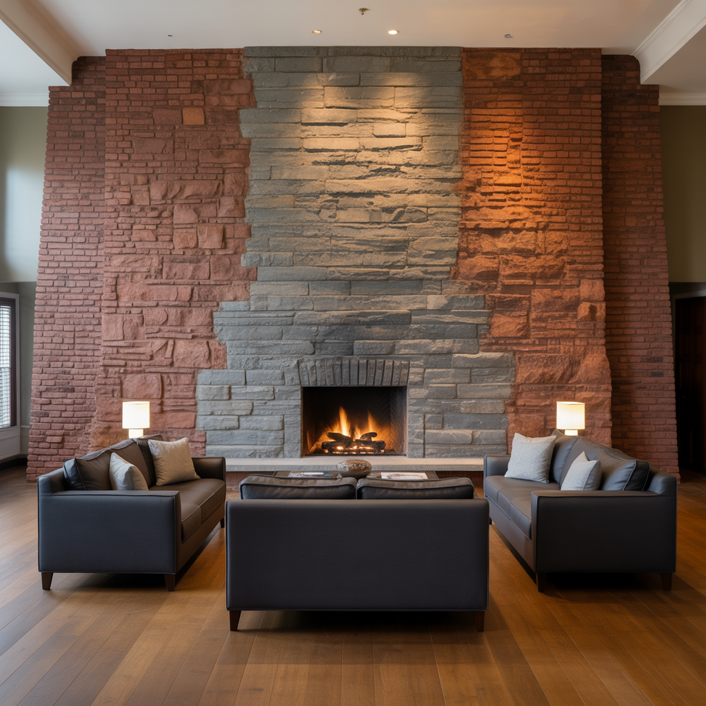 Mixing brick and stone creates โmaterial dialogueโโtwo related yet distinct textures conversing within single composition. This approach adds complexity and visual interest while maintaining cohesive earthiness that grounds the space.