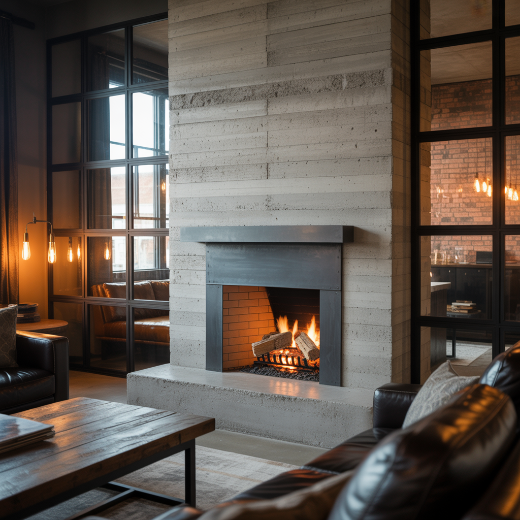 Concrete stone with metal accents embodies โurban organicismโโbringing raw industrial materiality into residential warmth. The combination speaks to adaptive reuse aesthetics, where warehouse bones meet domestic comfort, creating what I call โcultivated roughness.โ Metal elements provide linear counterpoints to concreteโs mass while introducing reflective surfaces that catch firelight dynamically.