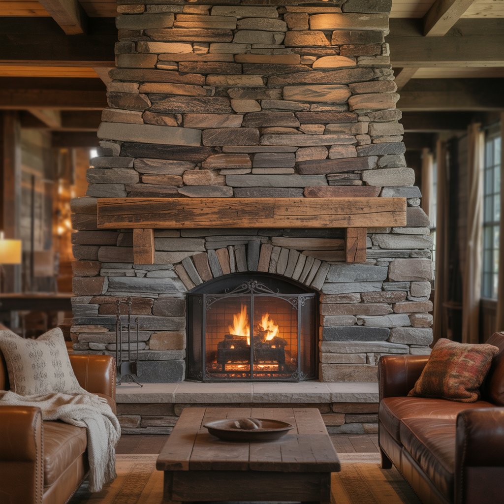 Rustic Stacked Stone Fireplace with Reclaimed Wood Mantel