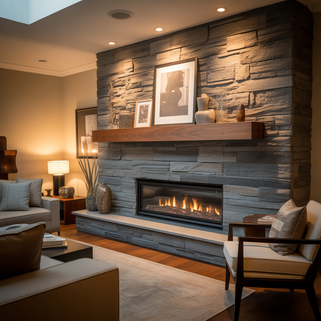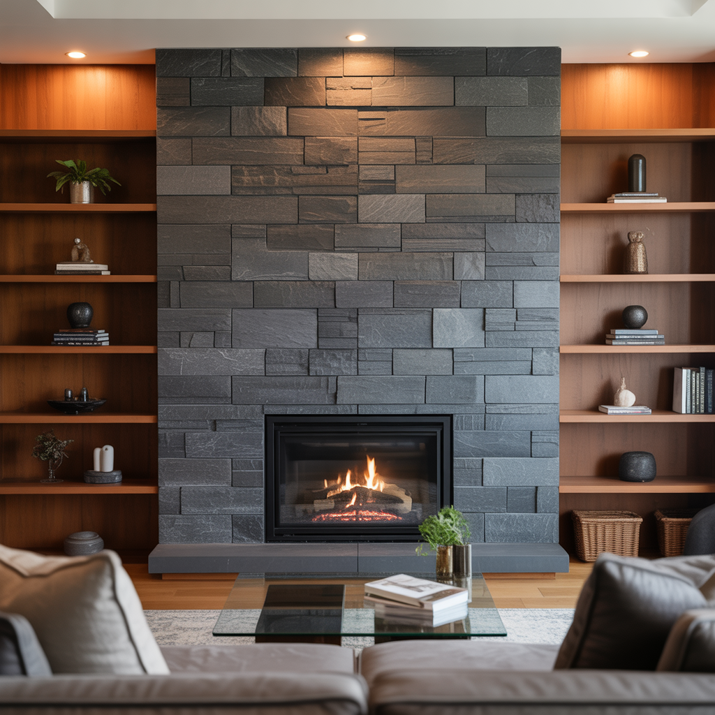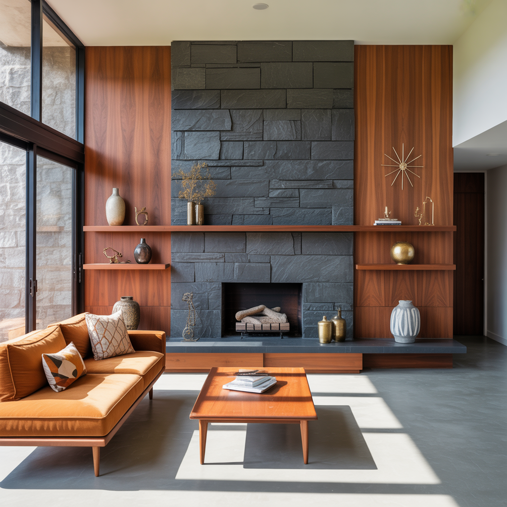 Slate Stone Fireplace with Mid-Century Modern Accents