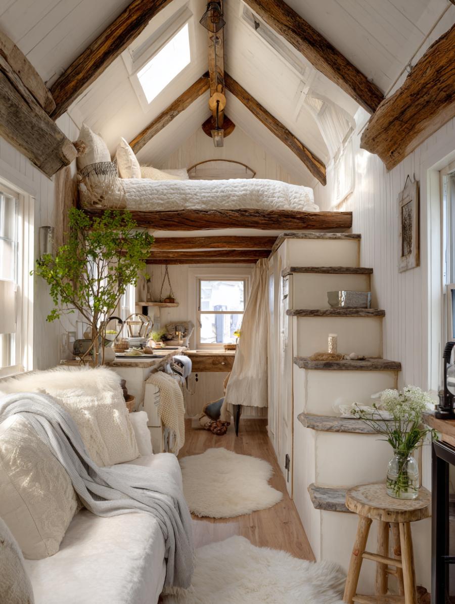 Rich reclaimed wood beams frame this thoughtfully designed tiny home where white shiplap walls and natural textures create an airy yet intimate atmosphere. The elevated sleeping loft maximizes vertical space while built-in storage stairs and floating shelves provide clever organization solutions throughout the compact layout.