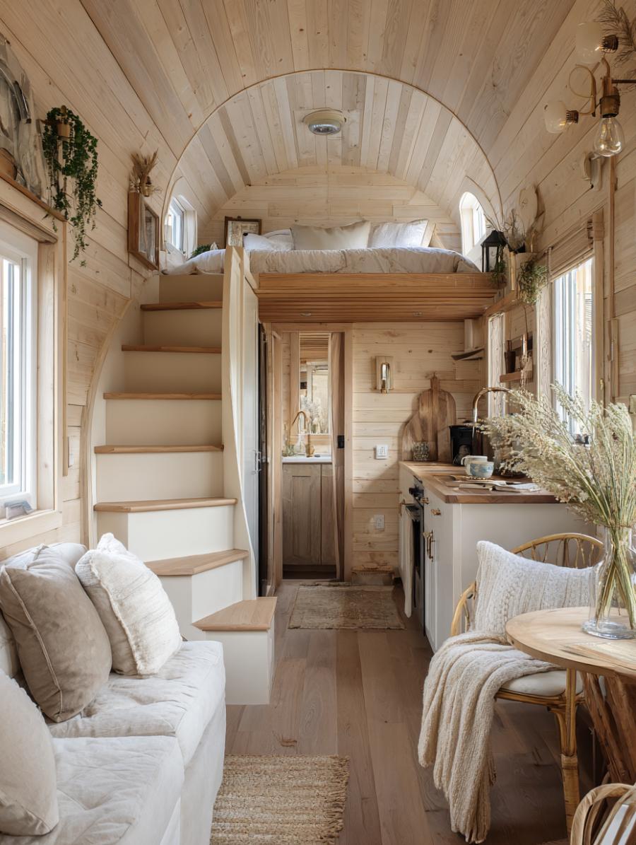Natural wood planks create a stunning barrel-vaulted ceiling that flows seamlessly into the walls, establishing a cohesive Nordic aesthetic throughout this compact home. Storage stairs with built-in seating lead to a cozy sleeping loft, while cream upholstery and dried botanicals add warmth against the blonde wood backdrop. Abundant windows flood the space with natural light, making the narrow layout feel surprisingly spacious and airy.