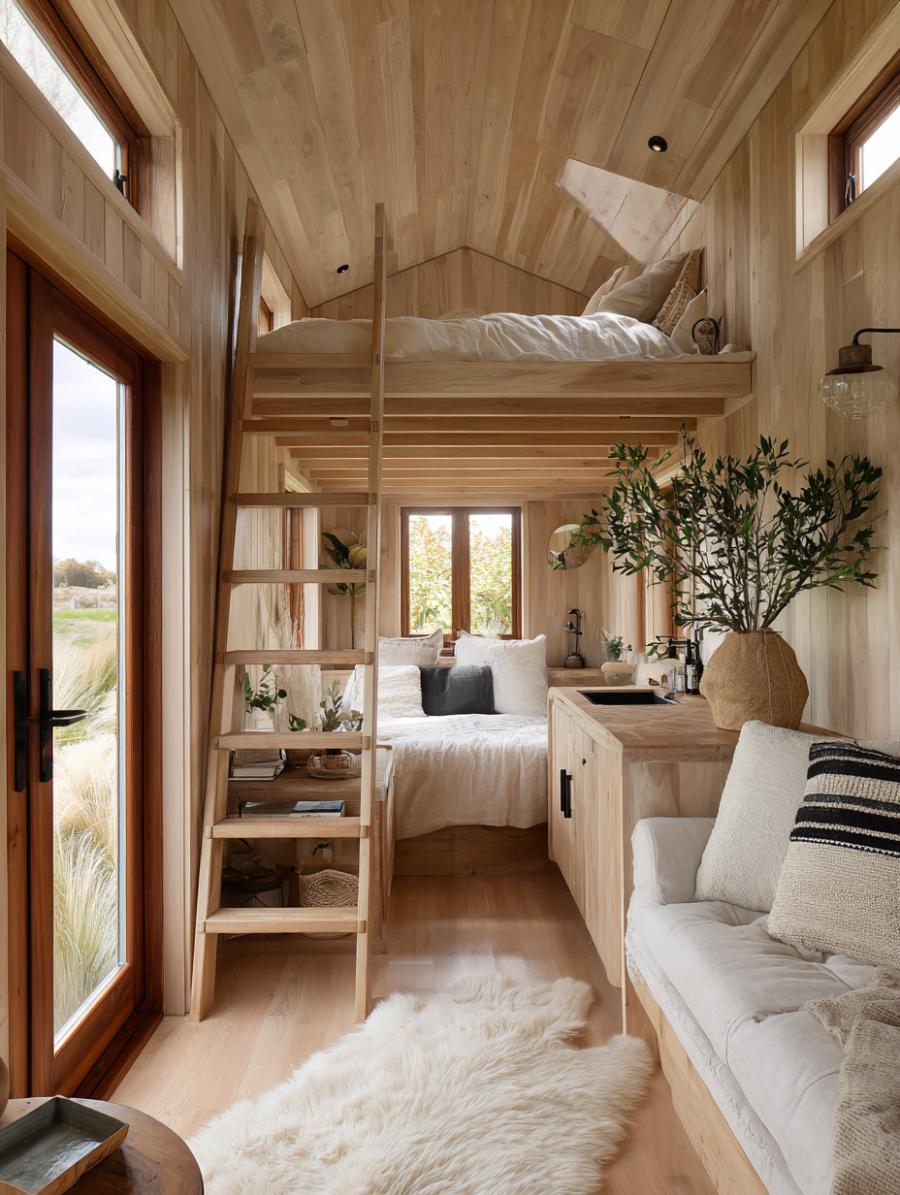 Natural Wood Haven Maximizes Vertical Space with Loft Sleeping Quarters