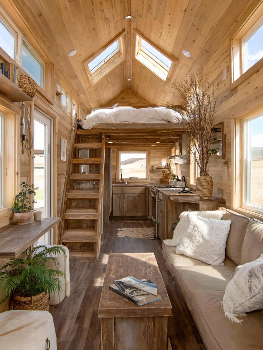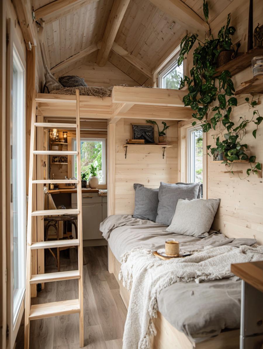 Light pine wood creates a serene Scandinavian atmosphere throughout this cleverly designed tiny home interior. Open ladder-style stairs lead to a cozy sleeping loft above, while cascading green plants soften the natural wood surfaces and add organic warmth to the neutral color palette.