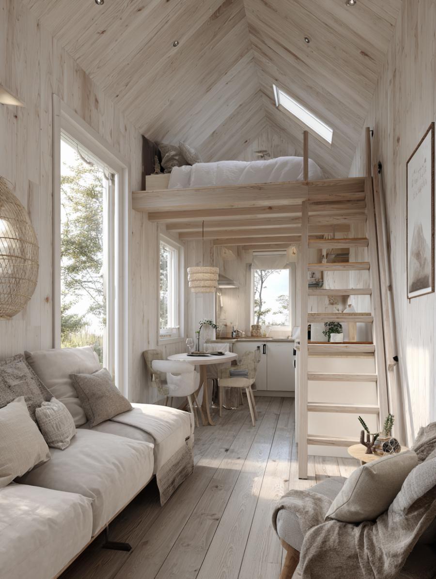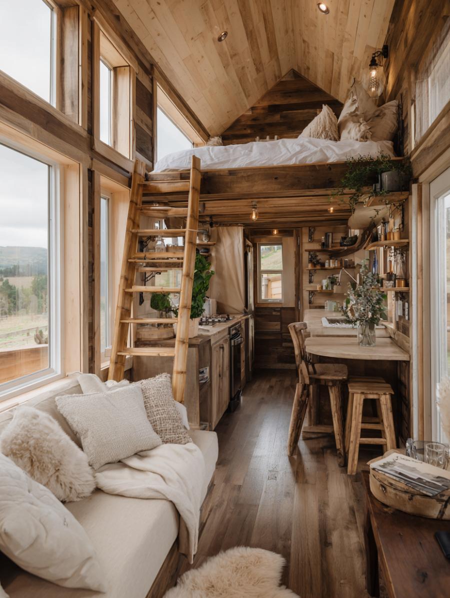 Natural wood planks wrap every surface from floor to vaulted ceiling, creating a cohesive cocoon of warmth in this cleverly designed tiny home. The raised sleeping loft accessed by a sturdy wooden ladder opens up precious floor space below for a compact kitchen, dining area, and plush seating nook. Large windows flood the neutral palette of creamy whites and honey-toned woods with abundant natural light, making the compact quarters feel surprisingly spacious.