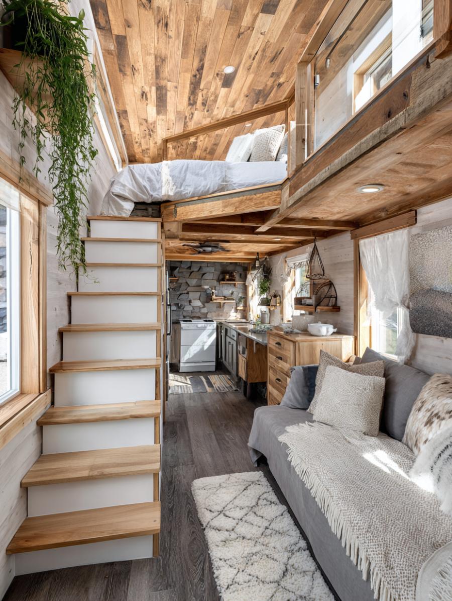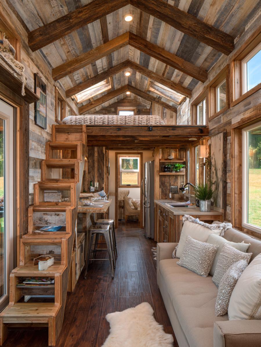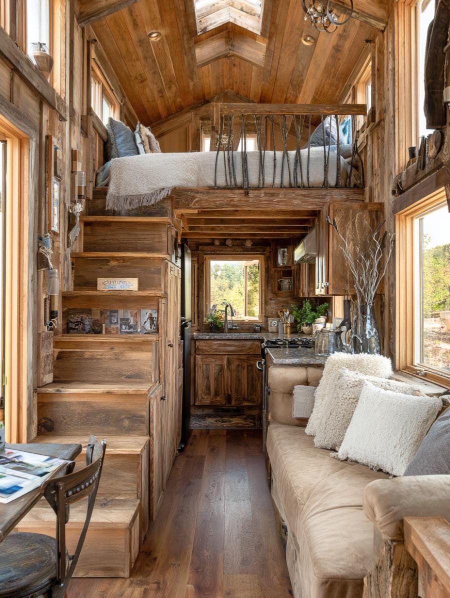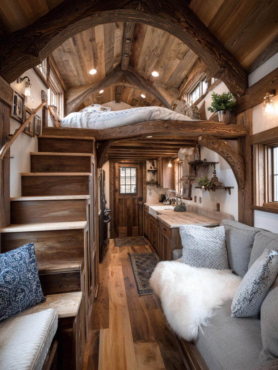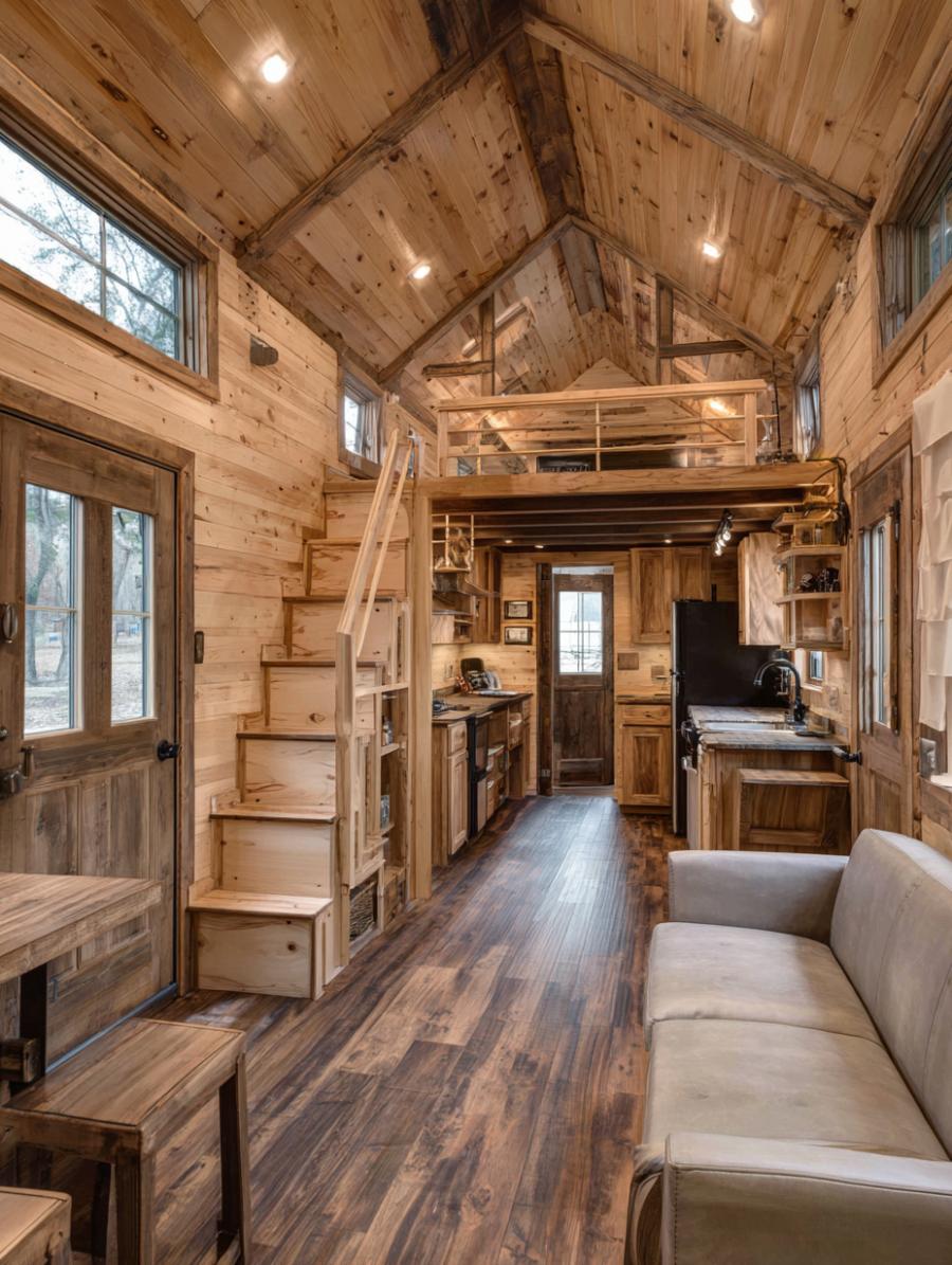 Rich reclaimed wood beams frame this expertly designed tiny home where every square inch serves multiple purposes. The sleeping loft perches above a fully functional kitchen and living area, while built-in storage stairs eliminate wasted space. Warm honey-toned wood throughout creates a cohesive flow that makes the compact footprint feel surprisingly spacious and inviting.