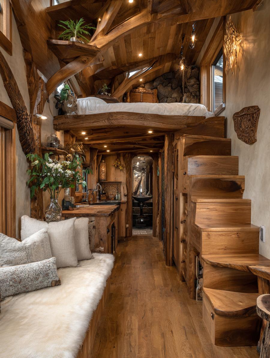 Exposed timber beams create dramatic architectural interest throughout this sophisticated tiny home, where a lofted bedroom floats above the main living area. Rich walnut stairs with built-in storage wind upward past a cozy seating nook, while warm Edison bulb lighting illuminates every carefully crafted detail. Natural materials blend seamlessly with neutral linen upholstery to achieve an elevated rustic aesthetic that maximizes both vertical space and visual impact.