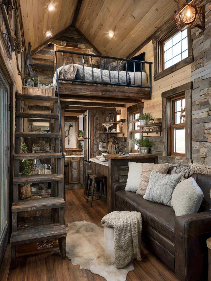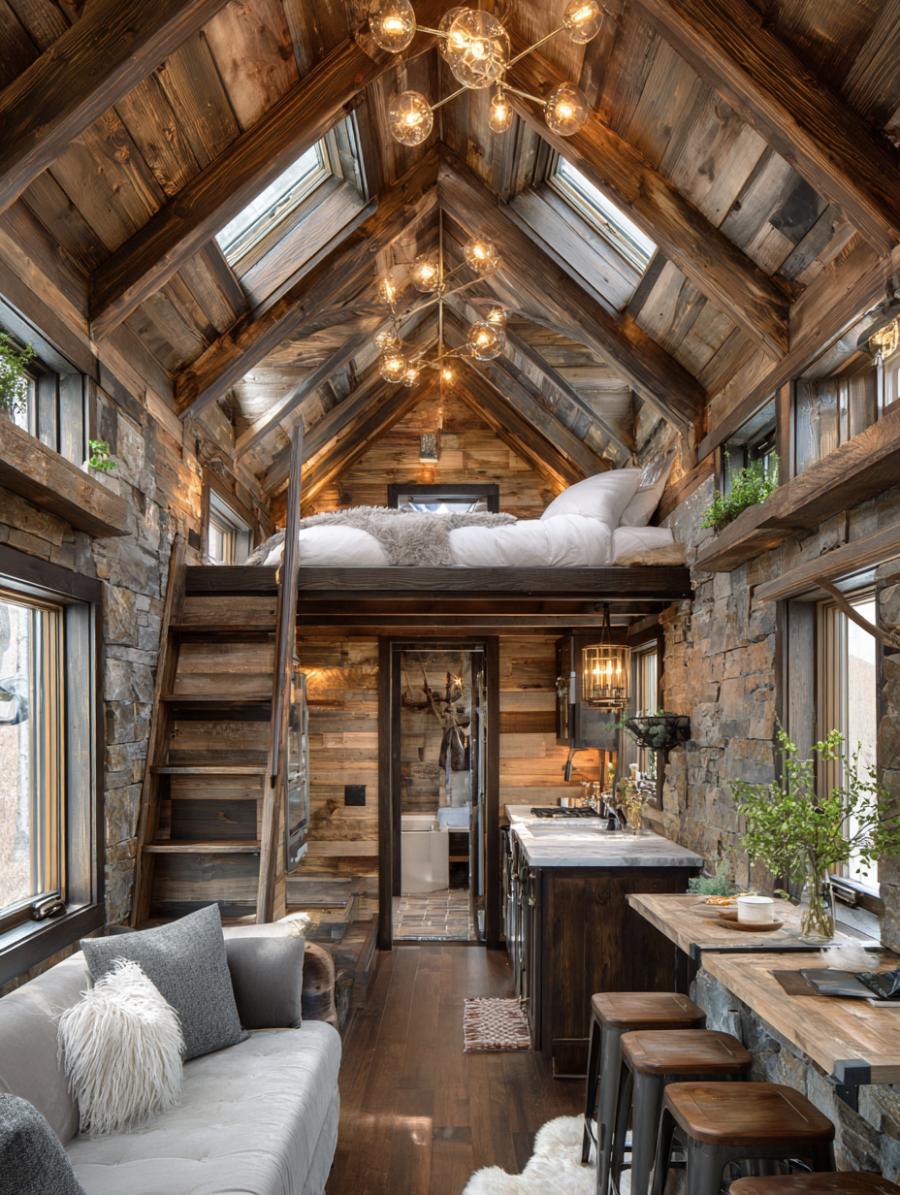 Cathedral Ceilings Meet Stone and Reclaimed Wood in Loft-Style Tiny Haven