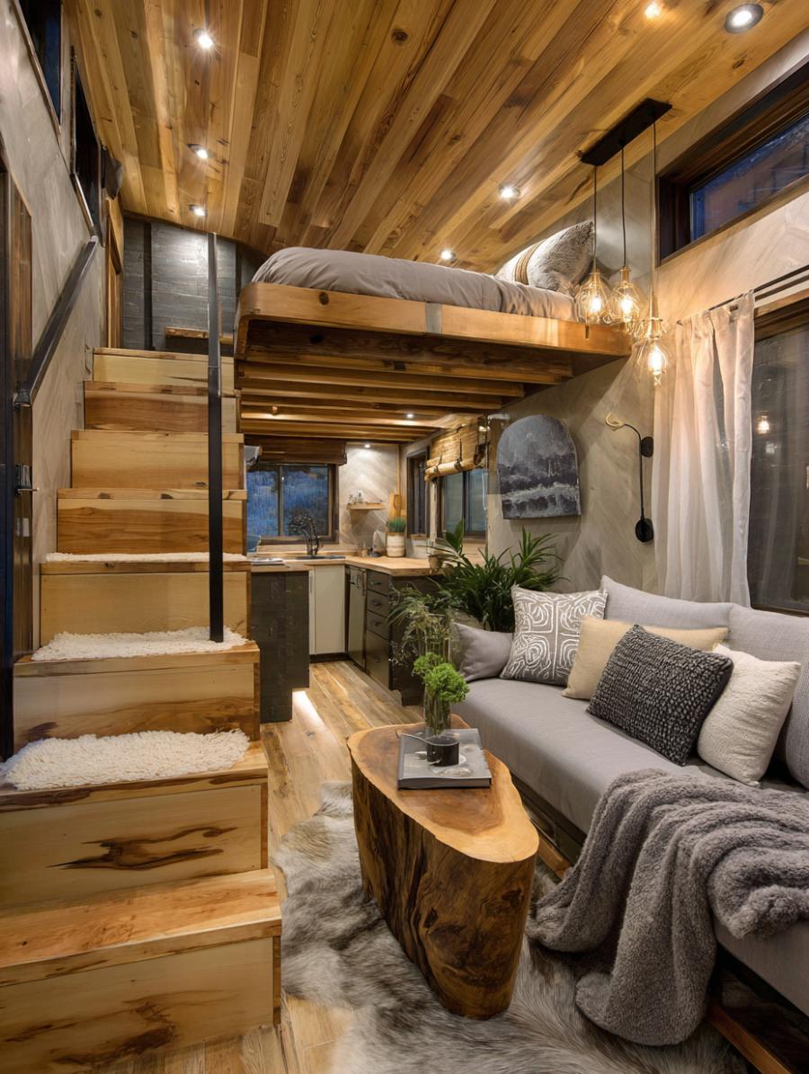 Raw wood ceiling beams and a striking live-edge coffee table anchor this sophisticated tiny home interior that cleverly positions the sleeping area above the main living space. Pendant lighting creates intimate zones while the neutral color palette of grays and natural wood tones maintains visual cohesiveness throughout the multi-level design. Built-in storage stairs and a cozy sectional sofa prove that luxury and functionality can coexist beautifully in compact square footage.