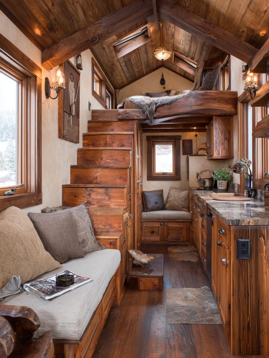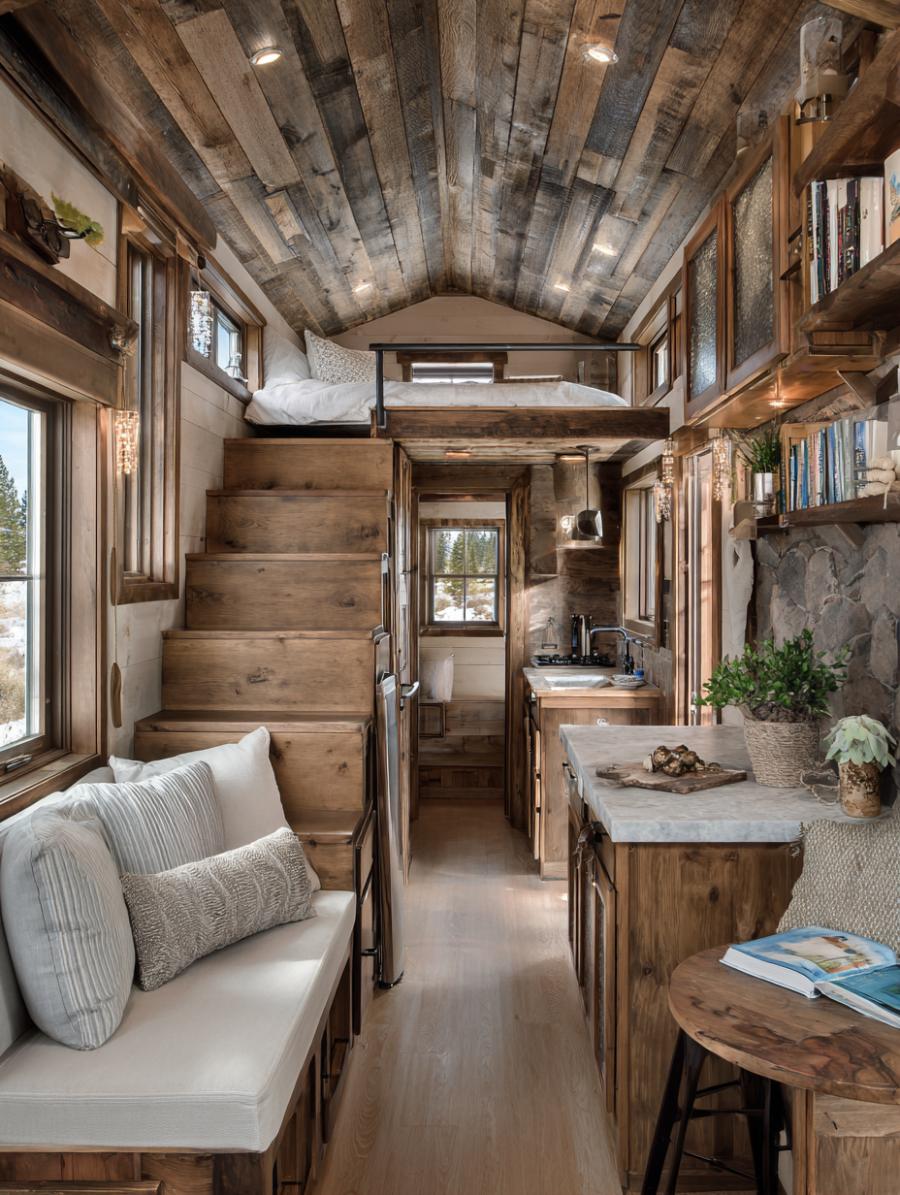 Rich cedar planking and exposed wooden beams create a warm cocoon effect throughout this cleverly designed tiny home interior. Built-in storage stairs lead to a cozy sleeping loft, while the galley kitchen features gorgeous stone countertops and custom cabinetry. Neutral linen seating and strategic lighting make the compact living area feel surprisingly spacious and inviting.