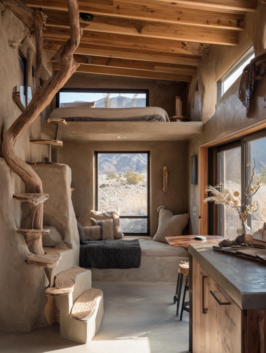 Natural wood beams stretch across the ceiling while an artistic tree branch staircase winds up to a cozy loft bedroom overlooking mountain vistas. Woven baskets and neutral textiles complement the adobe walls, creating an organic flow between indoor comfort and the rugged desert landscape visible through expansive windows.