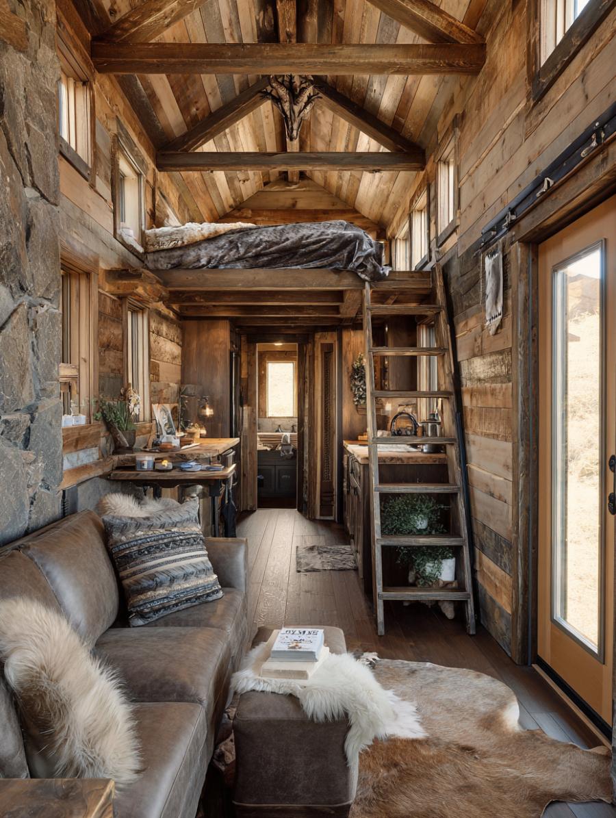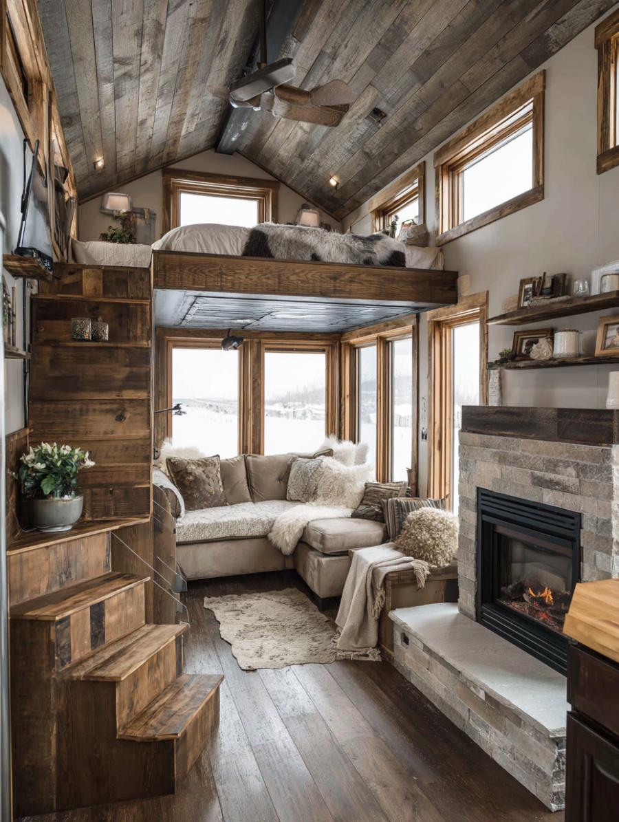 Reclaimed barn wood creates stunning visual texture across the vaulted ceiling and staircase, while a cleverly positioned loft bed opens up floor space for relaxing. Natural light floods through multiple windows, illuminating the stone fireplace and cozy sectional that transforms this compact interior into a warm mountain retreat.