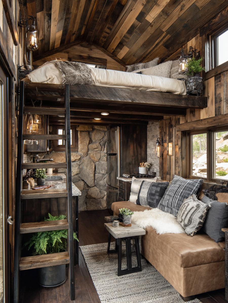 Rich reclaimed wood planks create stunning visual texture across every surface, from the slanted ceiling to the custom loft bed frame with integrated metal ladder. Warm Edison bulb pendant lights and lantern-style sconces cast a golden glow throughout the compact living area, while leather seating and stone fireplace elements add luxurious cabin charm. Smart vertical design places the sleeping area above a comfortable lounge space, proving that small square footage can deliver big style impact.