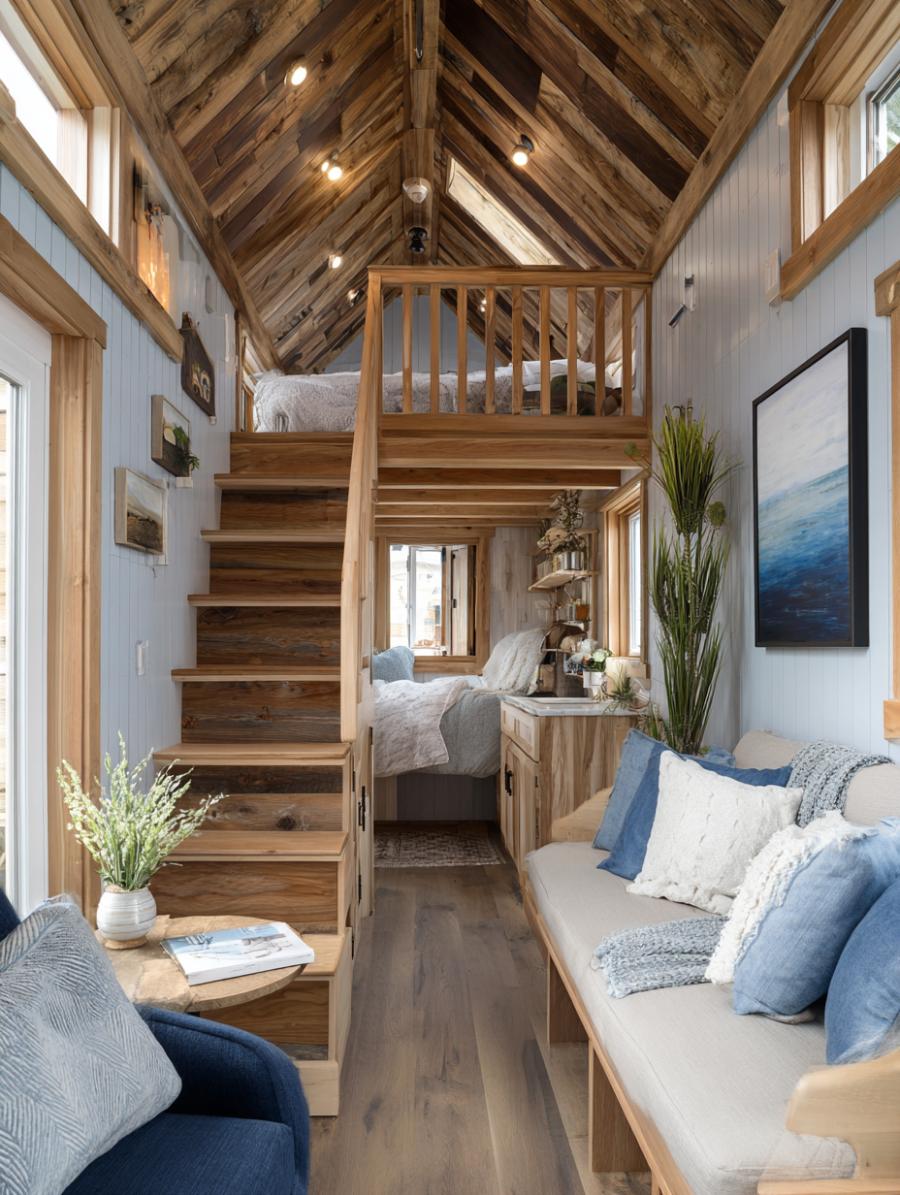 Coastal Blues Meet Reclaimed Wood in Multi-Level Tiny Haven