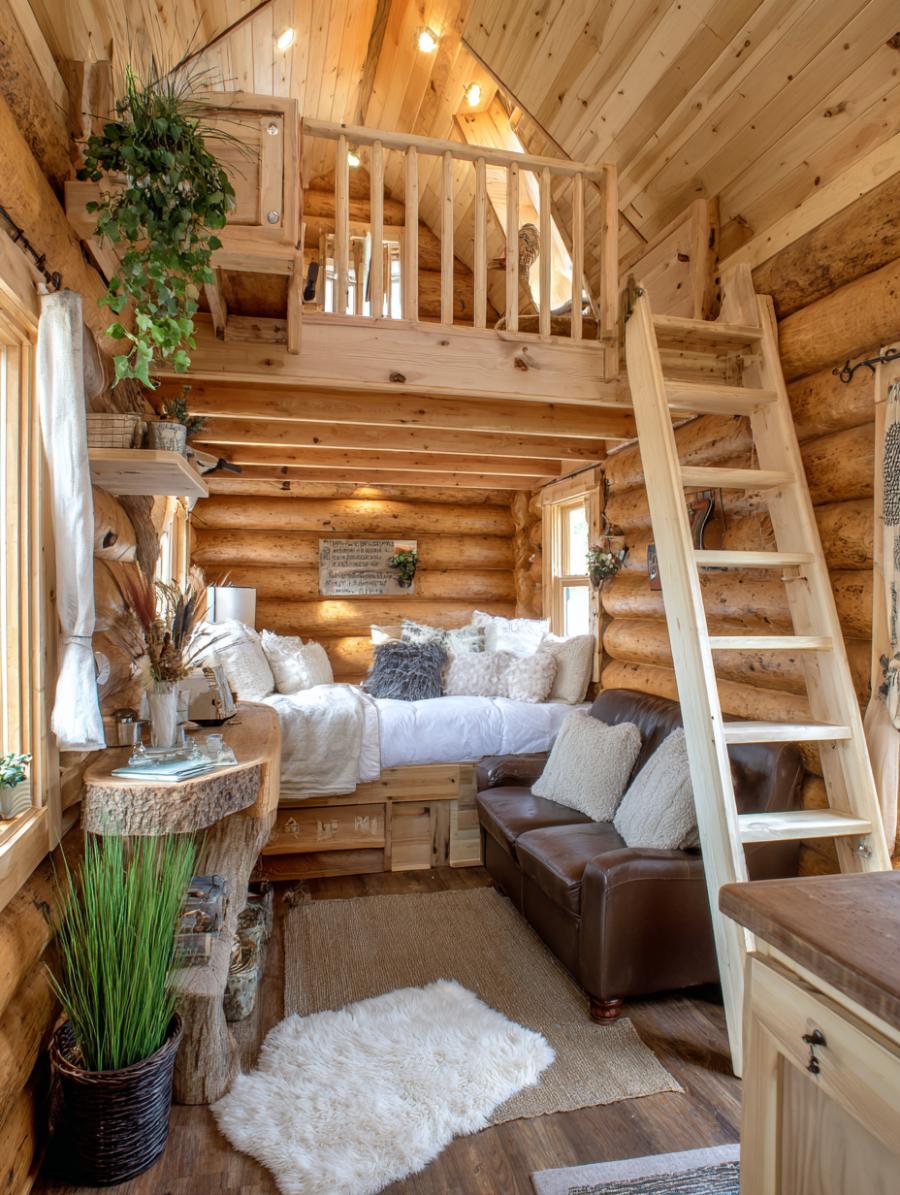 Exposed log walls create a warm foundation for this cleverly designed tiny home that places a cozy sleeping loft above an L-shaped seating area. Natural wood stairs double as storage drawers, while white linens and leather seating balance rustic charm with modern comfort. String lights suspended from the vaulted ceiling add magical ambiance to the compact yet luxurious living space.