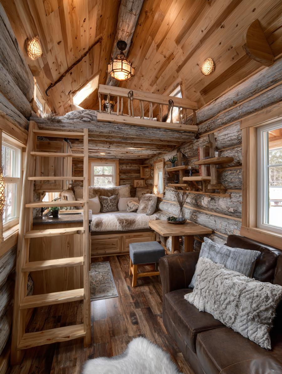 Weathered log walls and exposed ceiling beams create an authentic mountain retreat atmosphere in this expertly designed tiny home. Built-in bench seating with plush neutral cushions transforms the corner into a comfortable reading nook, while the loft bedroom above maximizes vertical space. Rich dark wood flooring anchors the warm color palette of creams, grays, and natural wood tones throughout.