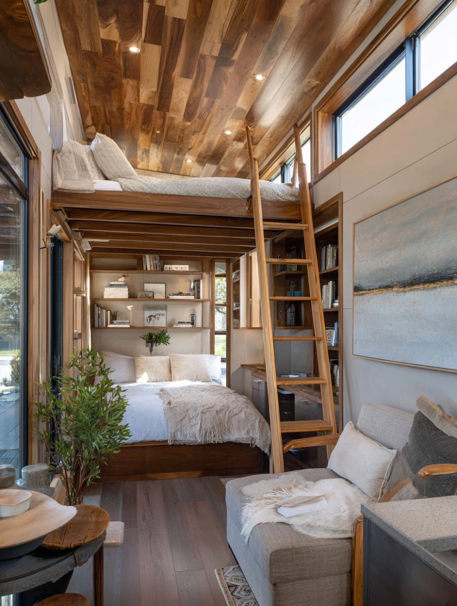 Lofted Bedroom Maximizes Vertical Space in Wood-Wrapped Tiny Haven
