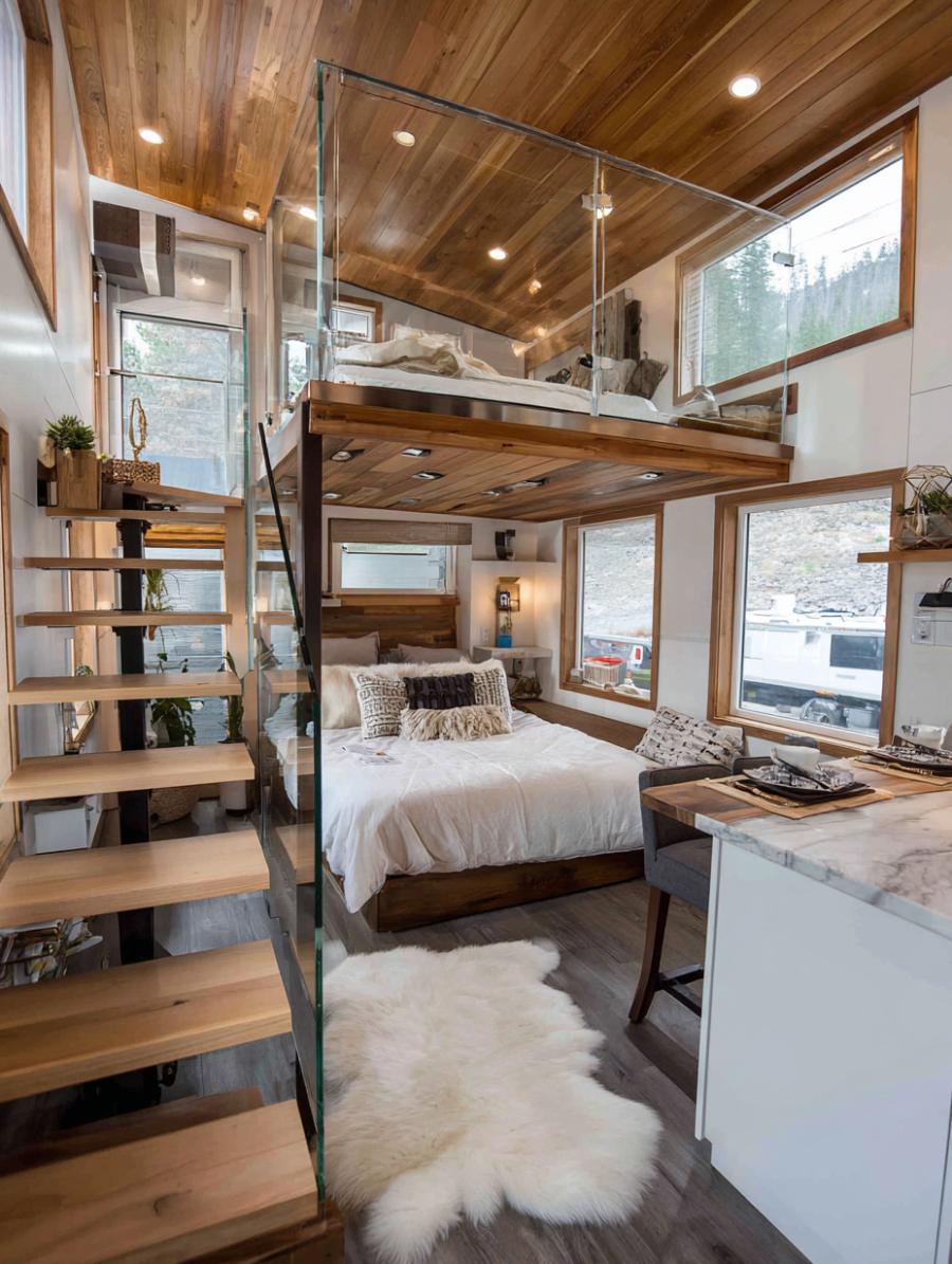 Natural wood planks create a stunning vaulted ceiling while a glass-railed loft doubles the living space in this ingeniously designed tiny home. Marble countertops and white fluffy rugs add luxurious touches that prove small spaces can deliver big style.