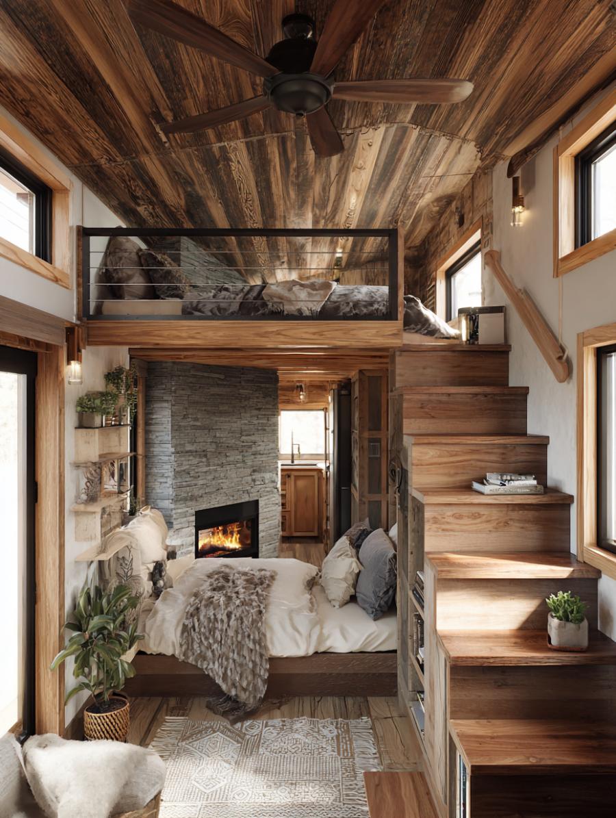 Rustic charm meets sophisticated design in this two-story tiny home featuring a dramatic reclaimed wood ceiling and exposed beam architecture. The stone fireplace anchors the sleeping area below while wide-plank stairs lead to an additional loft space above, maximizing every square foot with thoughtful vertical living. Natural light floods through multiple windows, highlighting the rich wood tones and creating an inviting sanctuary perfect for year-round comfort.