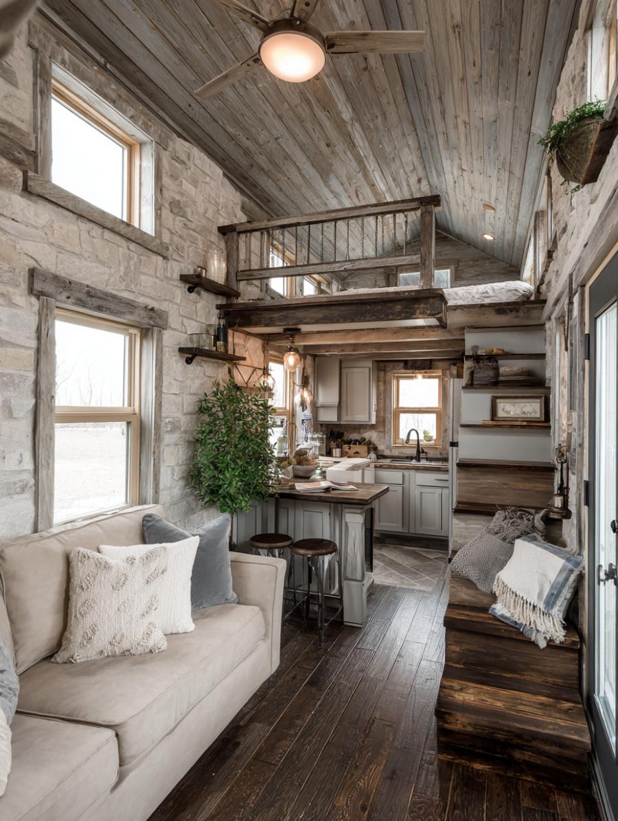 Weathered stone walls and reclaimed wood beams create dramatic vertical space in this thoughtfully designed tiny home. The elevated loft bedroom overlooks an open-concept living area where neutral furnishings complement the natural textures, while warm pendant lighting and floating shelves add both function and charm to the compact layout.