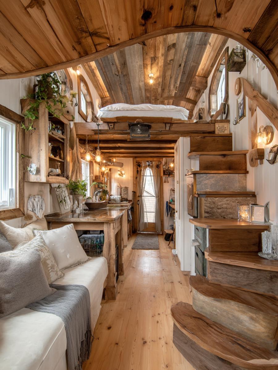Natural reclaimed wood planks create a stunning barrel-vaulted ceiling that draws the eye upward, making this compact space feel surprisingly expansive. Built-in storage stairs lead to a cozy loft bedroom while warm wood cabinetry and stone accents throughout establish perfect harmony between ruggedness and refined comfort.
