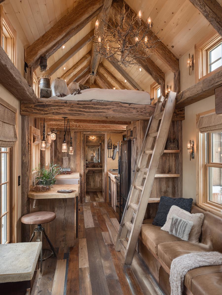 Exposed wooden beams create dramatic cathedral ceilings above this expertly designed tiny home interior that maximizes every square inch. Natural materials shine throughout, from the reclaimed wood ladder leading to the cozy loft bedroom to the leather seating area that doubles as storage. Warm pendant lighting and a statement branch chandelier cast a golden glow across the rich wood tones and neutral textiles.