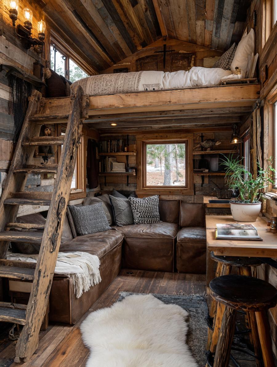 Weathered barn wood planks create a stunning backdrop for this elevated sleeping area that transforms every square inch into functional luxury. Rich leather seating below the loft provides comfortable lounging space, while rustic wooden stairs double as display shelving for books and personal treasures. Natural light streams through multiple windows, highlighting the beautiful patina of reclaimed materials throughout this thoughtfully designed tiny retreat.