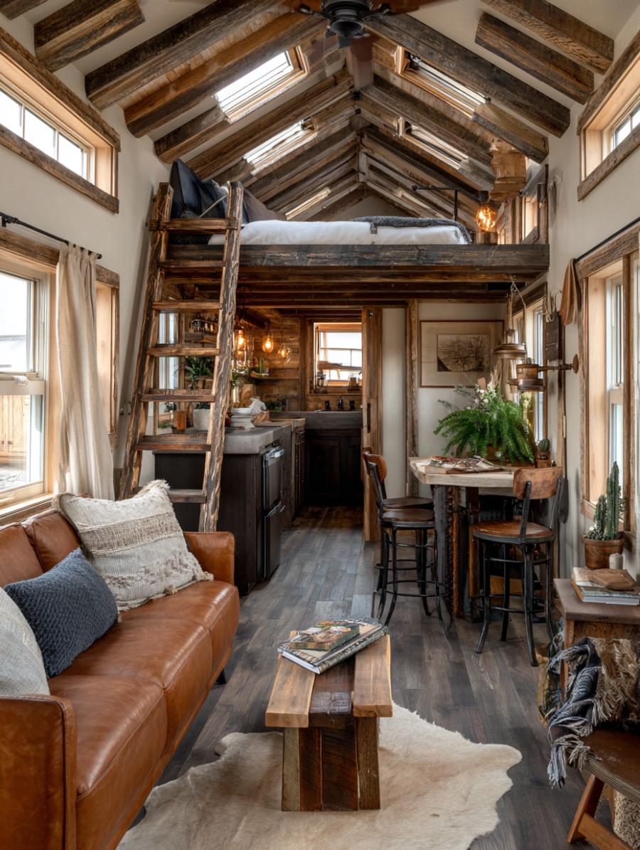 Rich leather seating anchors the living area while weathered wood beams stretch across vaulted ceilings, creating dramatic vertical space in this compact home. Edison bulb fixtures and a raised sleeping loft demonstrate how strategic design choices transform limited square footage into a luxurious retreat that feels both cozy and spacious.