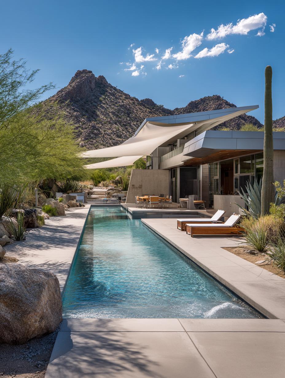 Sculptural concrete forms and sweeping rooflines create dramatic architectural tension against Arizona’s rugged peaks. The linear infinity pool stretches toward distant mountains while native agave and towering saguaro cacti frame the pristine water feature. Warm teak lounge furniture contrasts beautifully with cool concrete surfaces, while strategic boulder placement softens the transition between manicured pool deck and wild desert terrain.