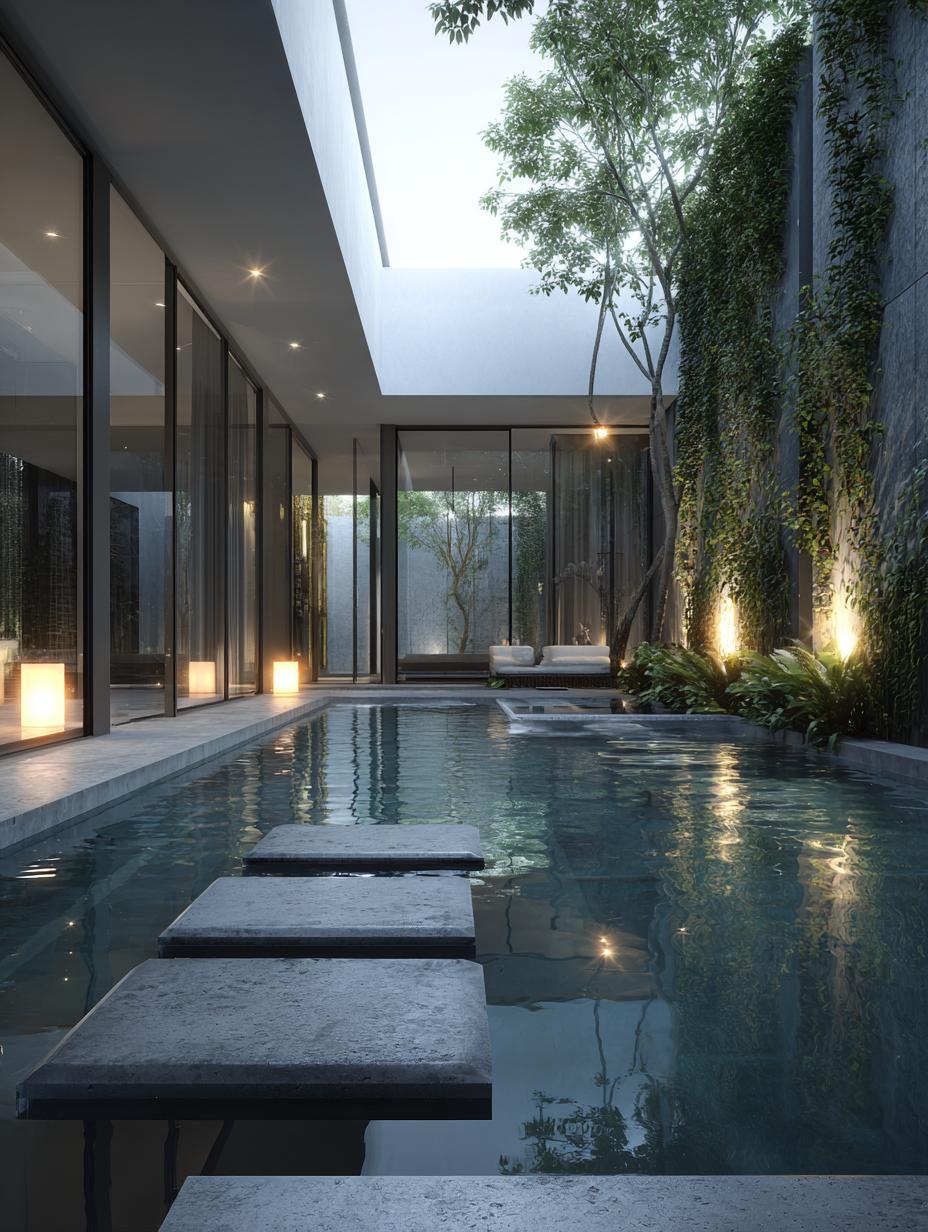 Floating concrete stepping stones create a meditative path across this serene infinity pool, while towering living walls cascade with lush greenery. Floor-to-ceiling glass panels dissolve boundaries between indoor and outdoor spaces, enhanced by warm ambient lighting that transforms the courtyard into an evening sanctuary. Modern minimalism meets biophilic design in this architectural masterpiece.