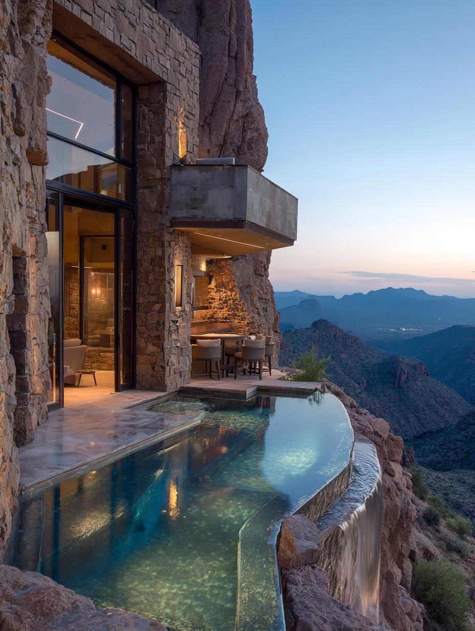Stone walls blend seamlessly with natural rock formations while an infinity pool cascades dramatically over the cliff edge. Floor-to-ceiling glass doors reveal warm interiors with contemporary dining furniture, creating perfect indoor-outdoor flow. Strategic lighting illuminates both the carved stone architecture and distant mountain vistas, transforming this desert retreat into an architectural masterpiece that celebrates raw natural beauty.