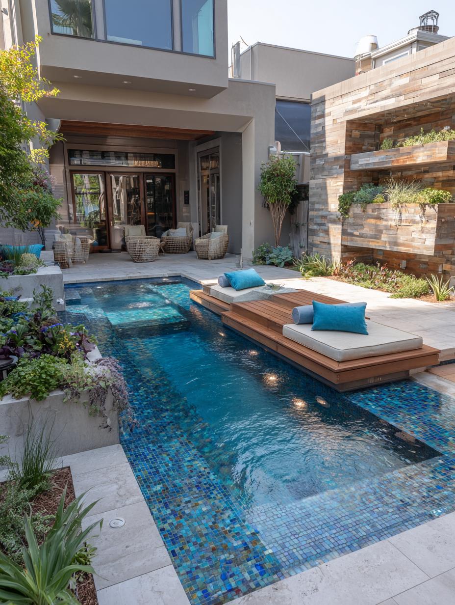 Blue mosaic tiles create stunning underwater artistry while a suspended teak platform with plush cushions floats dramatically above the water’s surface. Natural stone accent walls frame the contemporary architecture, seamlessly blending indoor-outdoor living spaces. Carefully curated plantings soften geometric lines, while wicker lounge chairs invite relaxation poolside. Strategic lighting illuminates both water features and architectural elements for enchanting evening ambiance.