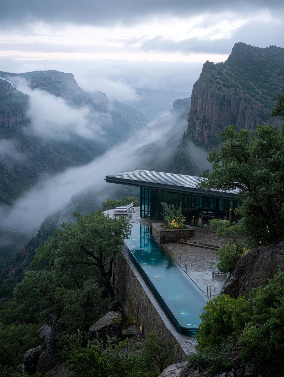 Carved into a dramatic clifftop location, this architectural marvel features an infinity edge pool that appears to float above fog-filled valleys. Modern glass pavilion architecture complements the natural stone retaining walls, while integrated LED lighting transforms the water into a glowing beacon at dusk. Strategic positioning maximizes the breathtaking canyon vistas, creating an unparalleled luxury retreat.