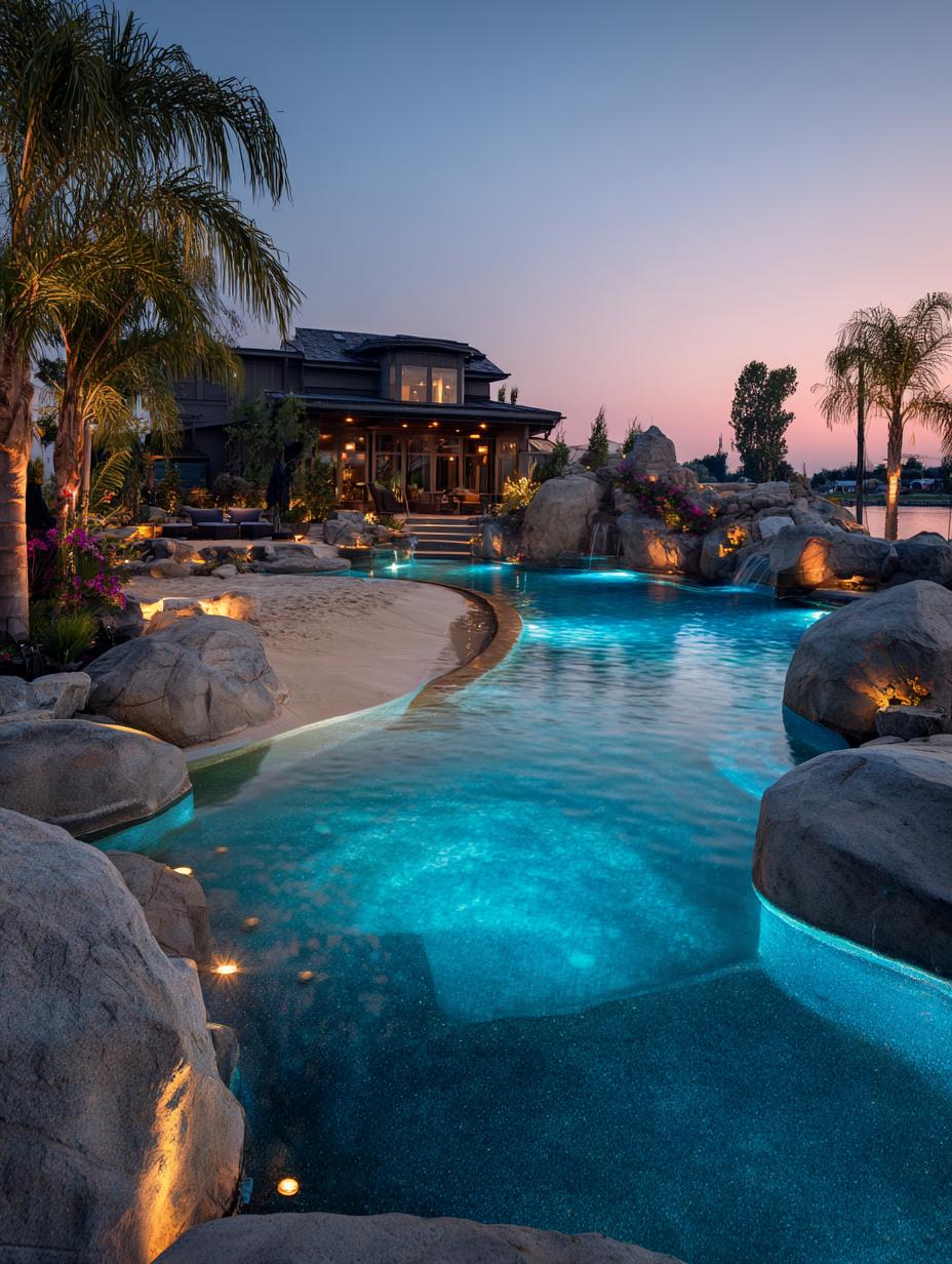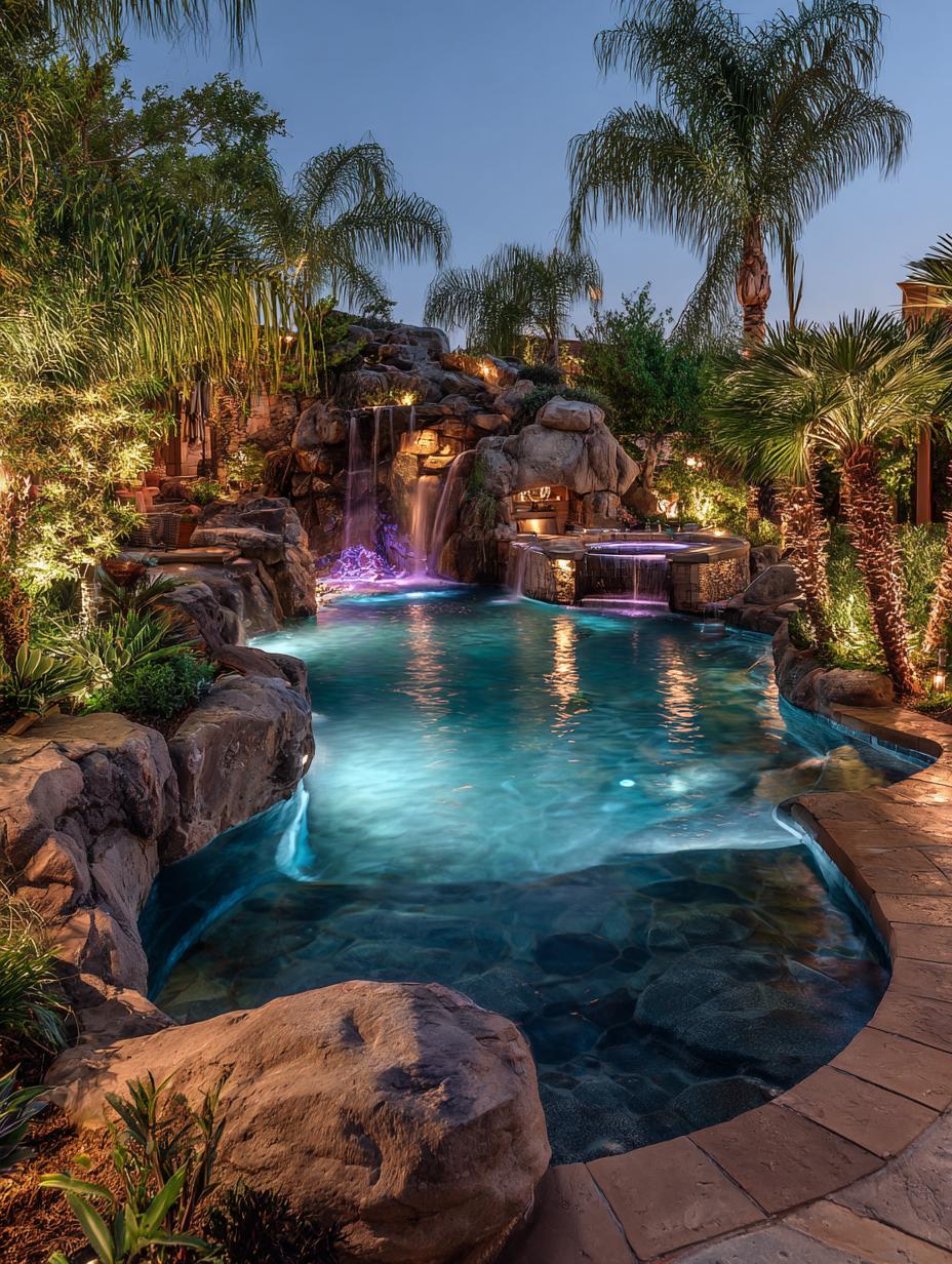 Lagoon-Style Paradise with Illuminated Rock Formations and Tropical Landscaping