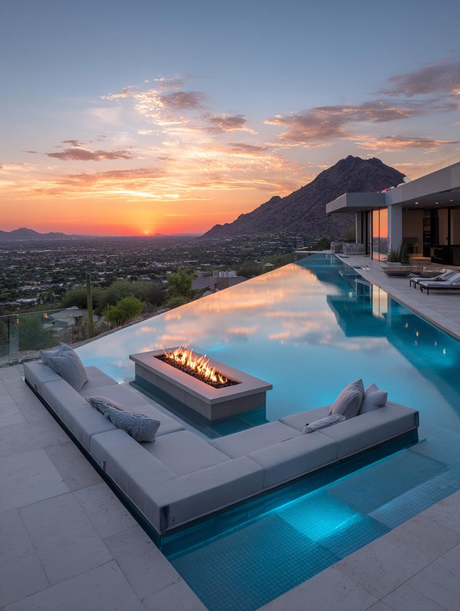 Desert Infinity Pool with Sunken Fire Lounge Creates Ultimate Outdoor Oasis