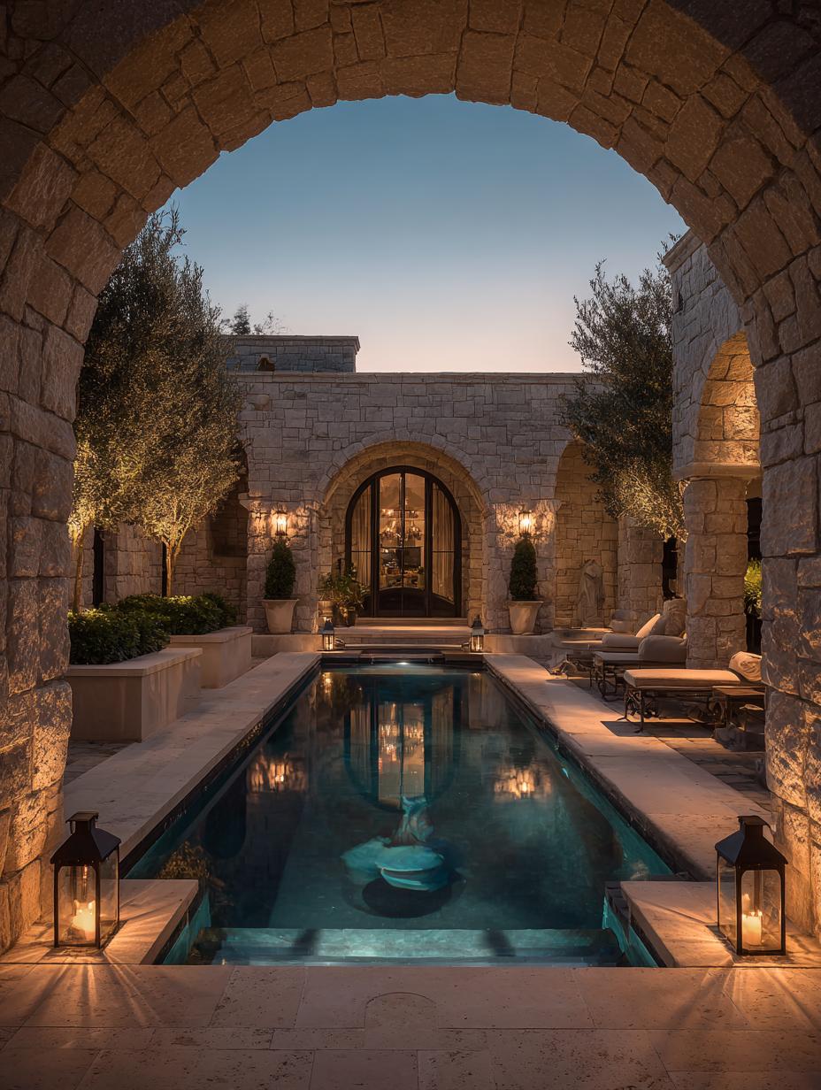 Carved limestone archways frame this breathtaking courtyard pool, where ancient Mediterranean architecture meets modern luxury. Olive trees in oversized bronze planters create natural columns along the stone walls, while warm uplighting transforms the space into an evening sanctuary. The rectangular reflection pool mirrors the illuminated archway, creating dramatic depth and architectural drama. Strategically placed lanterns and subtle ground lighting enhance the timeless elegance of this million-dollar outdoor retreat.