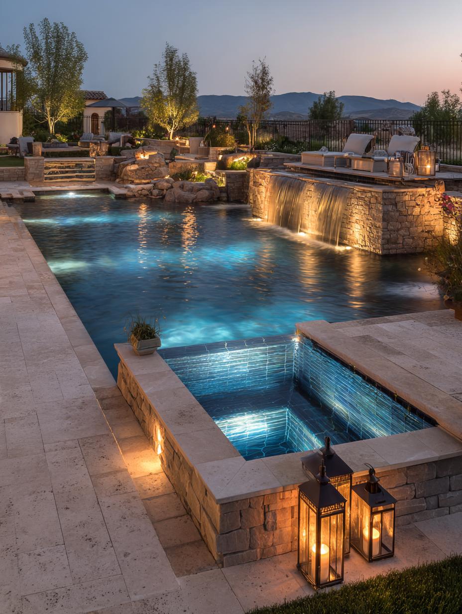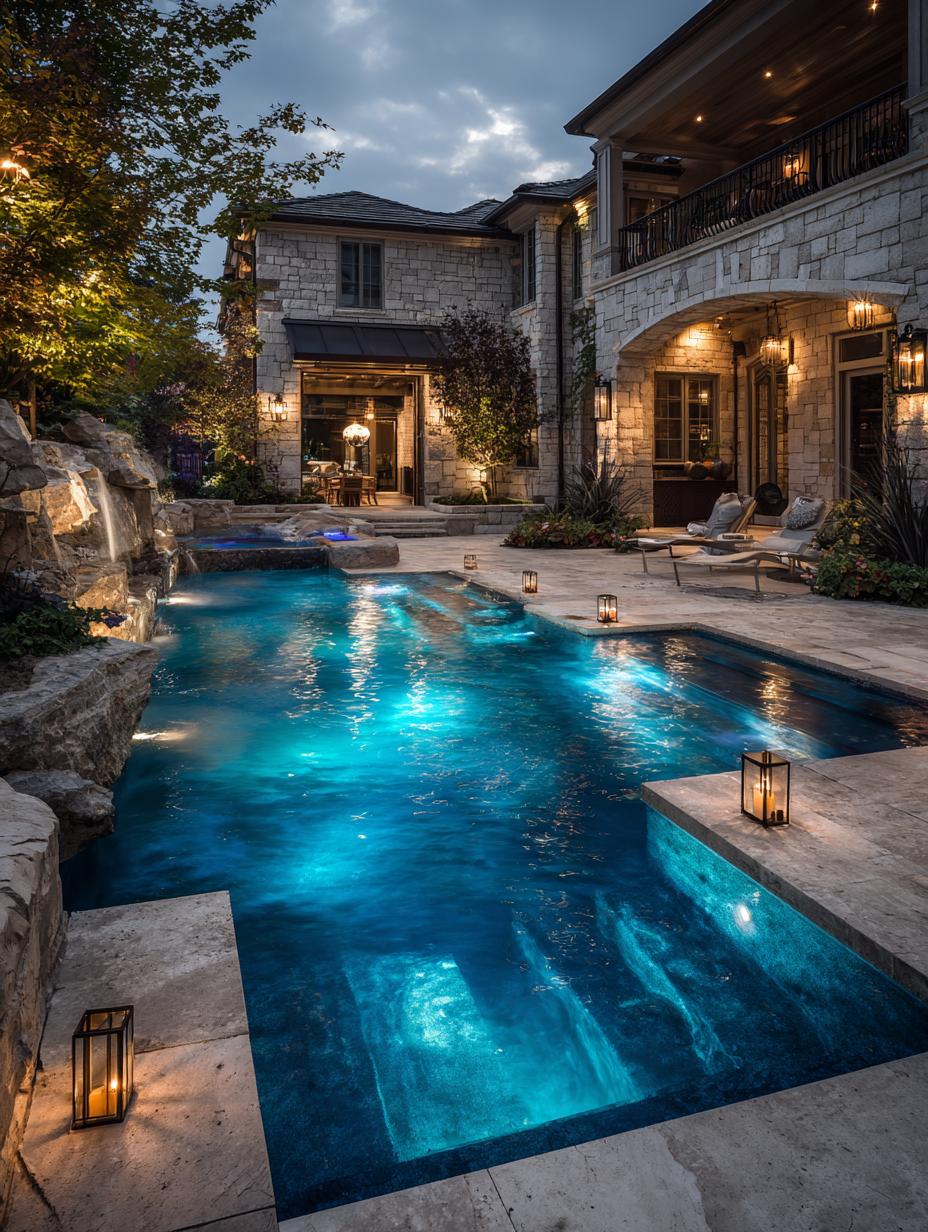 Warm limestone exteriors frame this resort-style infinity pool that seamlessly blends into the twilight horizon. Underwater LED lighting transforms the crystalline waters into a glowing sapphire jewel, while natural stone waterfalls cascade dramatically from sculptural rock formations. Travertine decking extends the luxurious palette, punctuated by flickering lanterns that cast romantic shadows across multiple entertaining zones and covered loggias.