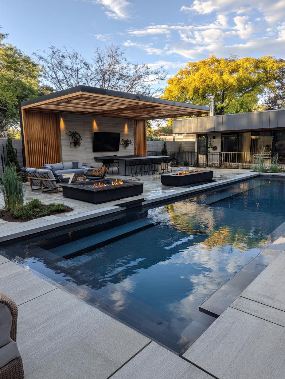 Sleek rectangular fire features anchor this sophisticated poolscape, extending dramatically over crystalline waters while warm flames dance across their minimalist surfaces. Rich walnut slatted ceilings shelter contemporary gray seating arrangements, while integrated LED strips illuminate the pavilion’s clean lines. Natural stone decking flows seamlessly around the geometric pool, creating distinct zones for lounging, dining, and fireside conversations that rival five-star resort amenities.