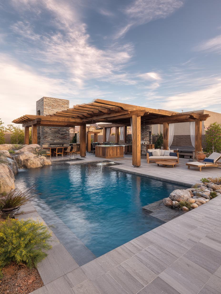 Desert Oasis Pergola Design With Natural Stone Pool Integration