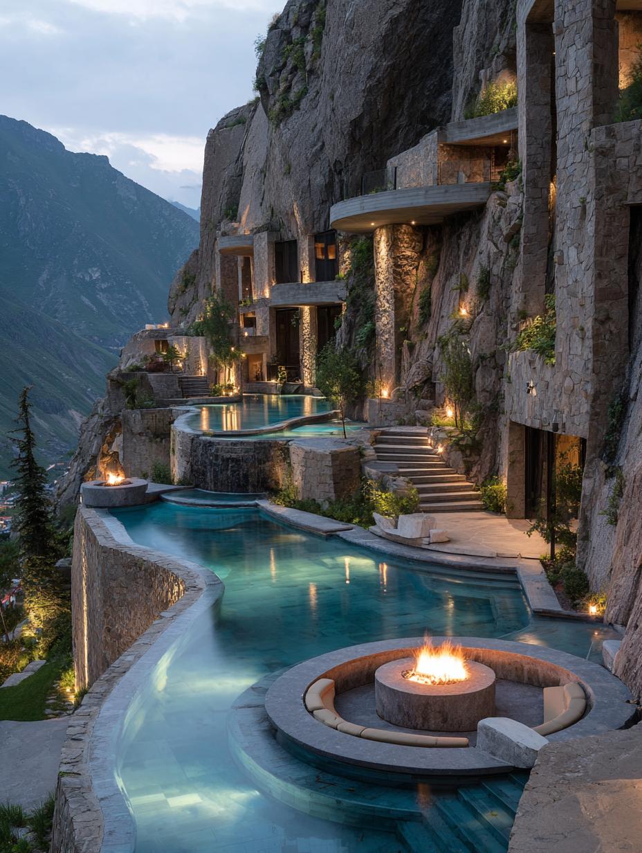 Cliffside Stone Sanctuary Features Multi-Level Infinity Pools and Fire Elements