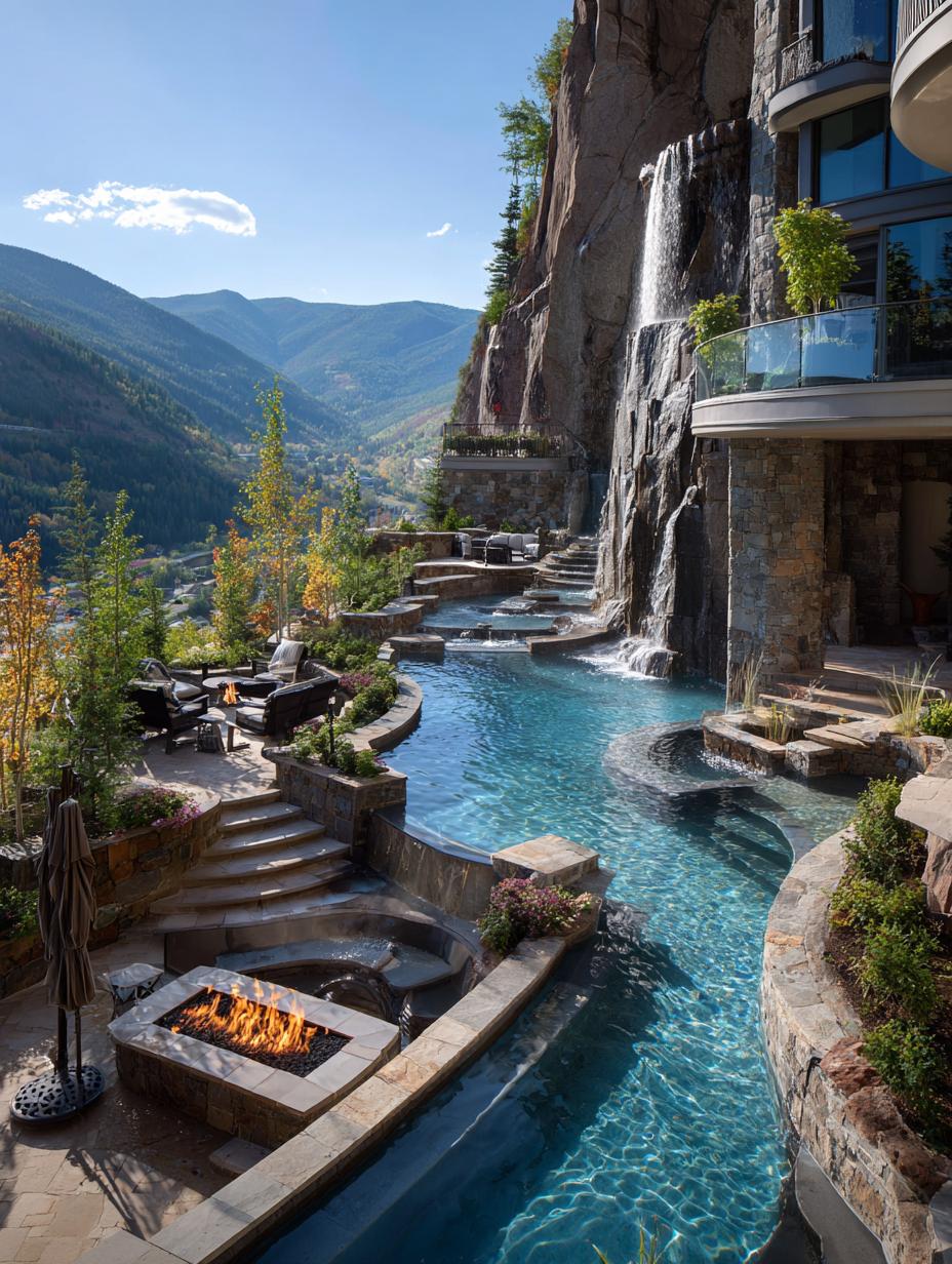 Carved into dramatic mountainside terrain, this resort-style infinity pool cascades through multiple levels of natural stone terracing. The design seamlessly integrates with the rocky cliff face, featuring flowing waterfalls that pour from elevated spa sections into the main swimming area. Strategic fire features and outdoor seating areas create intimate gathering zones, while glass-railed balconies above maximize the breathtaking valley views across this extraordinary landscape.