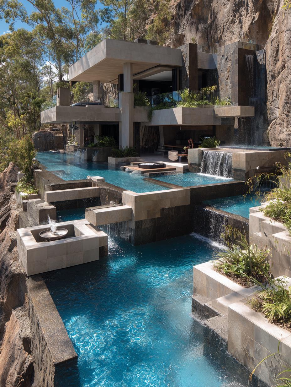 Natural stone formations embrace this architectural marvel where concrete platforms create dramatic elevation changes throughout the pool system. Water cascades between multiple levels, connecting geometric swimming areas with integrated spa zones and sculptural seating elements. Modern brutalist design harmonizes with the rugged cliff backdrop, while strategic plantings soften harsh concrete edges and create intimate gathering spaces around each water feature.