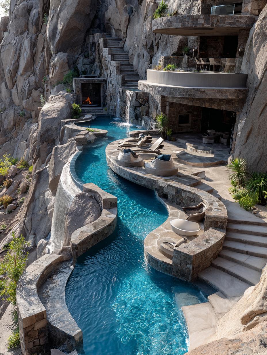 Carved directly into towering rock formations, this extraordinary pool paradise transforms raw canyon walls into a multi-level aquatic retreat. Natural stone masonry seamlessly integrates with the existing geology, while the serpentine pool curves gracefully around organic rock outcroppings. Stone steps cascade down multiple levels, connecting intimate seating areas with a dramatic waterfall feature. Desert plantings in strategic crevices soften the dramatic stonework, creating an oasis that feels both wild and refined.