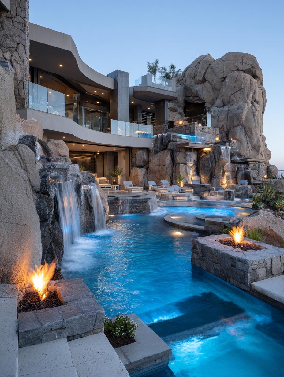 Cascading waterfalls tumble from towering natural stone formations while blue LED underwater lighting transforms this desert pool into an evening spectacle. Multiple fire bowls positioned throughout the stone landscape create dramatic focal points that reflect off the water’s surface. Contemporary glass railings and built-in seating areas seamlessly blend modern luxury with raw geological beauty, establishing the ultimate entertainment destination.