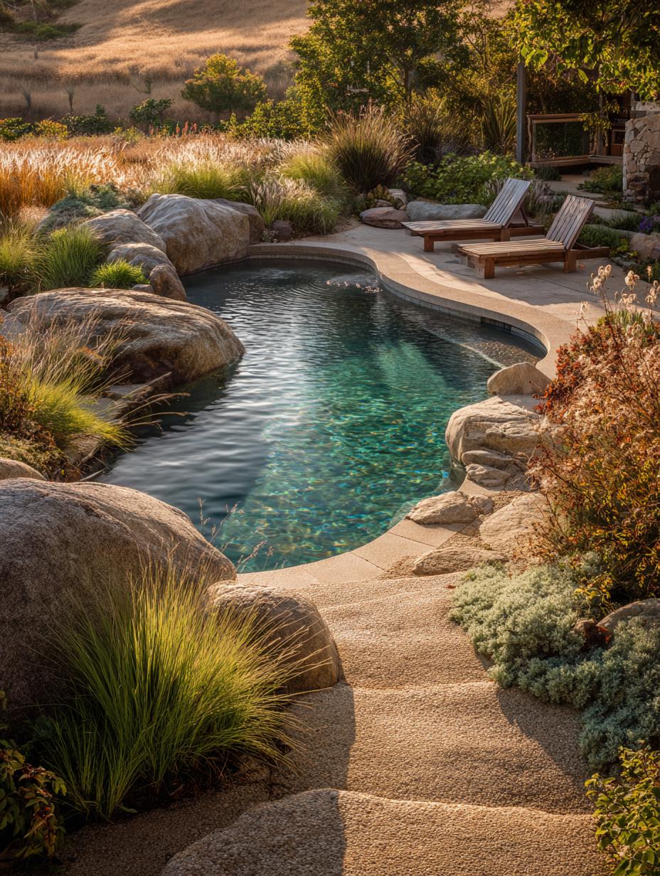 Massive granite boulders create a stunning natural border around this kidney-shaped pool, seamlessly blending into drought-resistant plantings of ornamental grasses and native shrubs. Warm golden hour lighting illuminates the turquoise water while teak lounge chairs positioned on natural stone decking offer prime relaxation spots. The organic design philosophy extends throughout the landscape, where decomposed granite pathways wind between sculptural rock formations and carefully curated Mediterranean plants that thrive in arid climates.