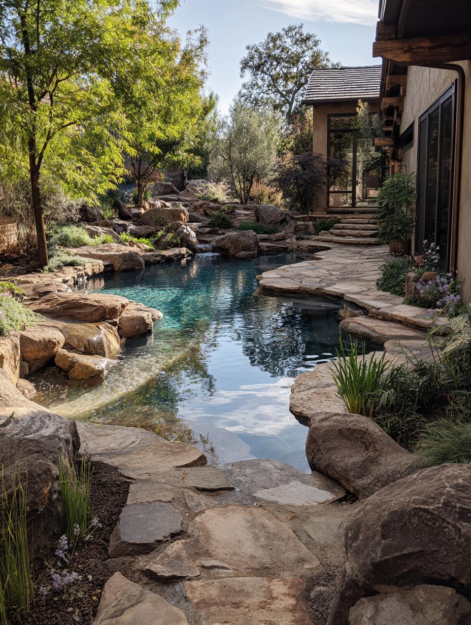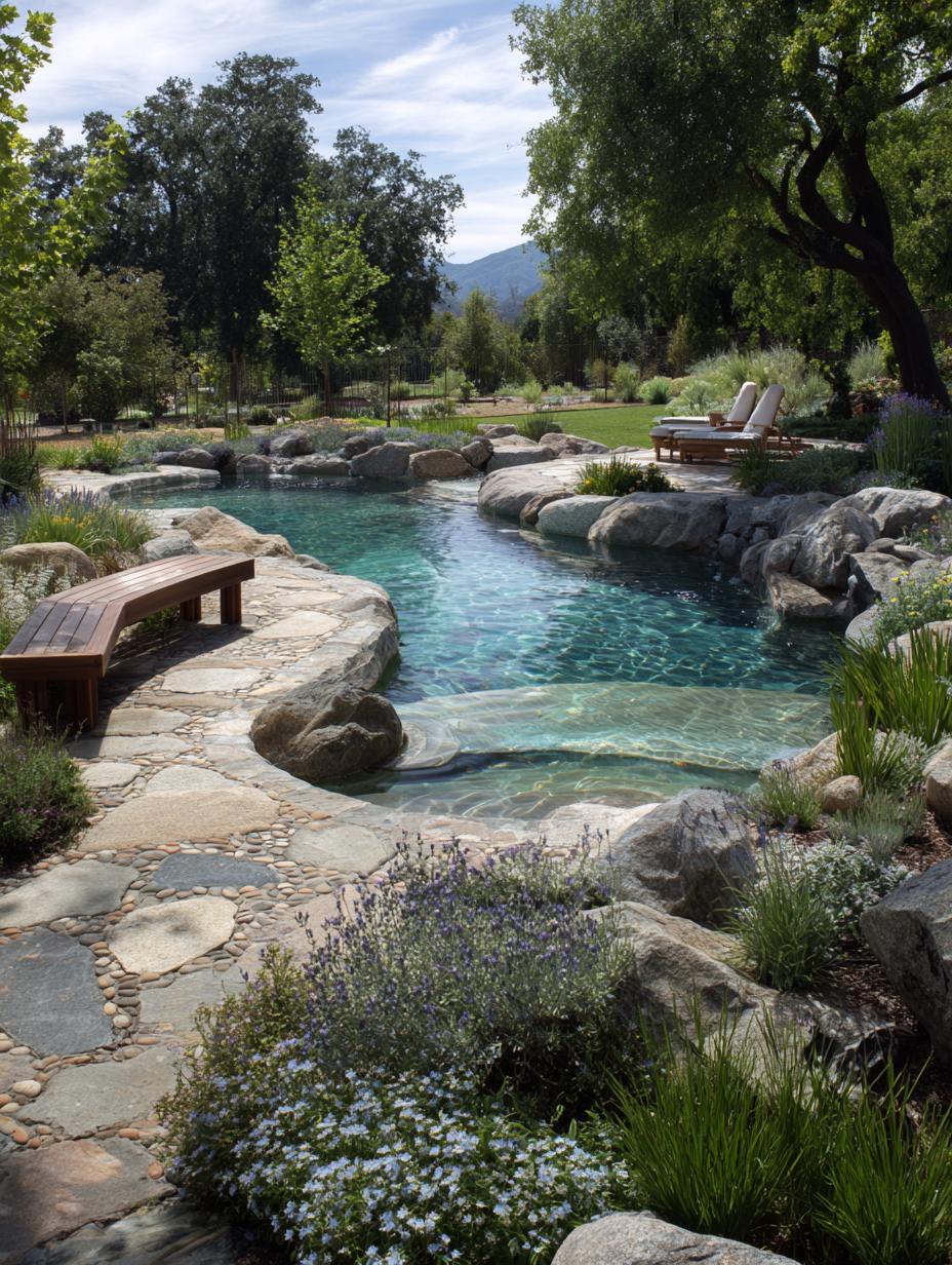 Massive boulders create an organic swimming sanctuary where crystal-clear turquoise waters wind through natural stone formations. Curved wooden benches follow the lagoon’s edge while native grasses and purple flowering plants soften the hardscape. Mountains provide a dramatic backdrop to this resort-style oasis that transforms any backyard into a private retreat. Strategic landscaping with drought-resistant plantings maintains the natural aesthetic year-round.