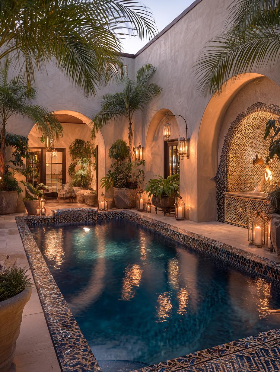 Moroccan-Inspired Courtyard Pool with Mosaic Tile Fountain Creates Resort Ambiance