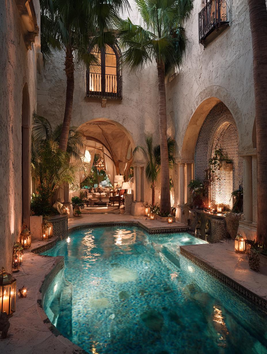 Handcrafted stone arches frame this breathtaking courtyard pool, where traditional Moroccan tilework meets contemporary luxury. Antique brass lanterns cast dancing shadows across weathered limestone walls, while towering palm trees create natural columns in this architectural masterpiece. Intricate geometric patterns line the pool’s edge, transforming the water into a glowing centerpiece that reflects centuries-old Islamic design principles with modern resort-style sophistication.